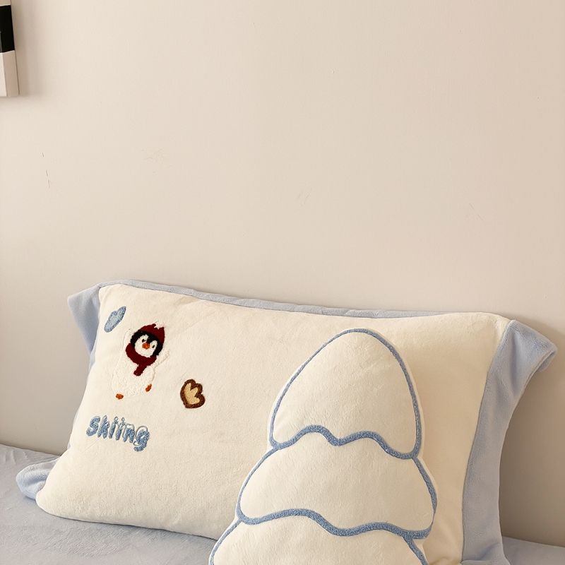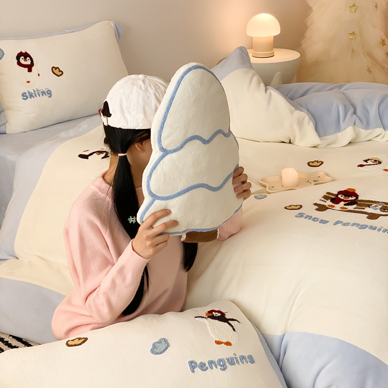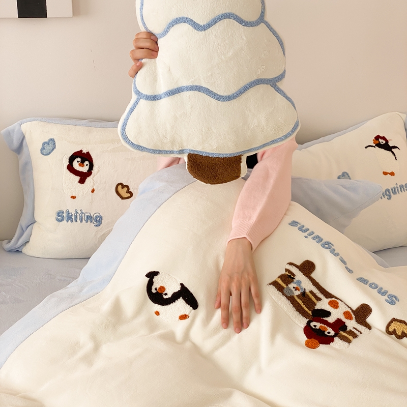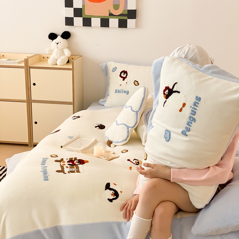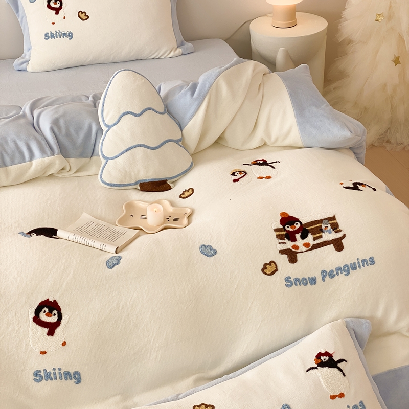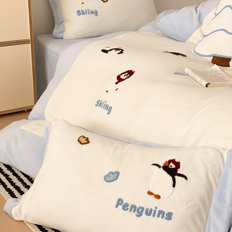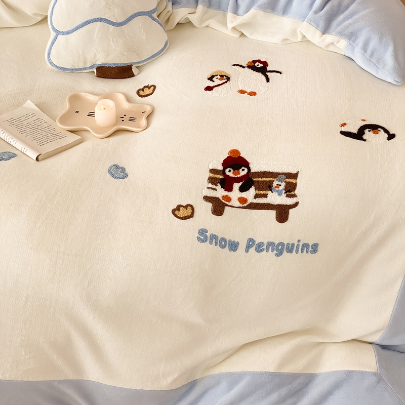 曼布缇 2025新款卡通款加厚牛奶绒毛巾绣花四件套-小企鹅 小企鹅-蓝
