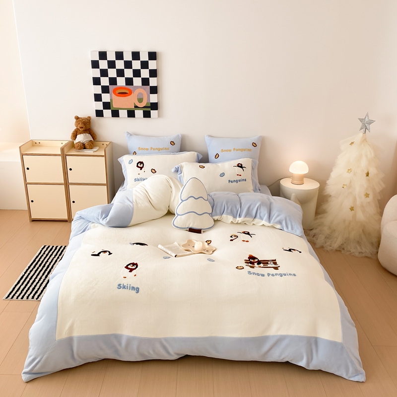 商品名称:曼布缇 2025新款卡通款加厚牛奶绒毛巾绣花四件套-小企鹅 小企鹅-蓝