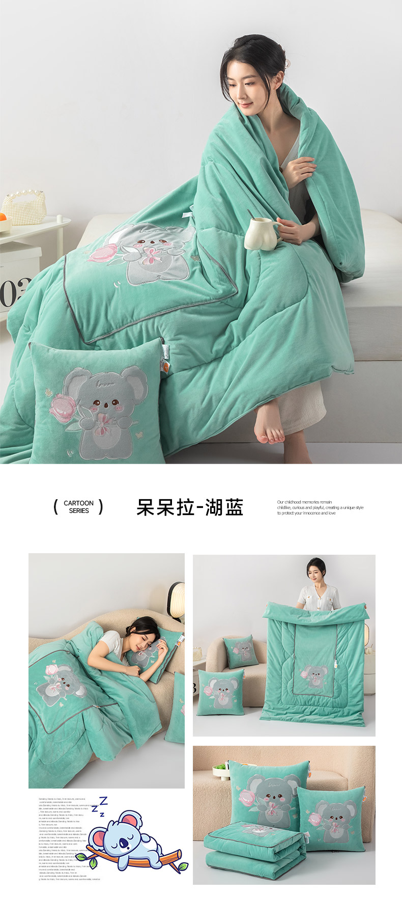 商品名称:雷人家纺 2024新款A类加厚加重贴布绣婴儿绒抱枕被 呆呆拉-湖蓝
