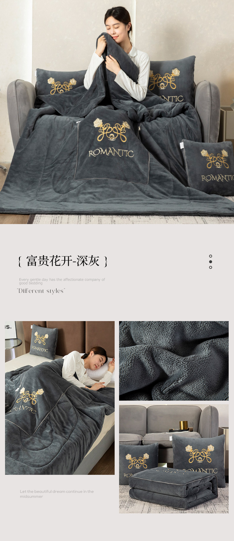 (总)雷人家纺 2023新款倾城花恋水晶绒刺绣多功能抱枕被,倾城花恋-深灰,倾城花恋-浅灰,倾城花恋-天蓝,倾城花恋-柚黄