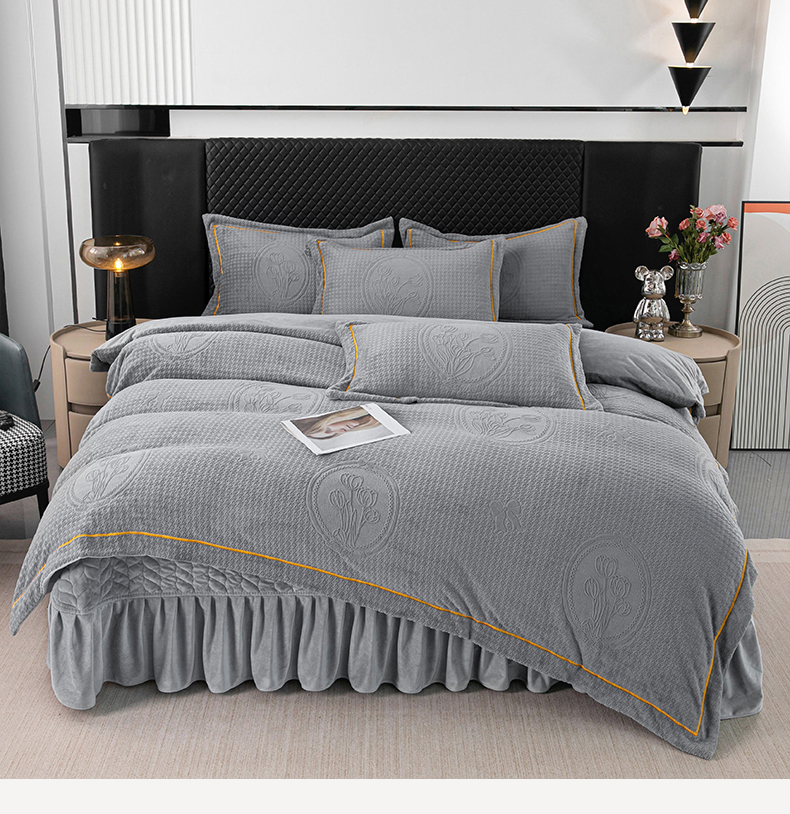 商品名称:畅畅家纺 2025新款12斤加厚冬季轻奢款230克全消光立体雕花牛奶绒夹棉床盖四件套 轻奢花语-深灰