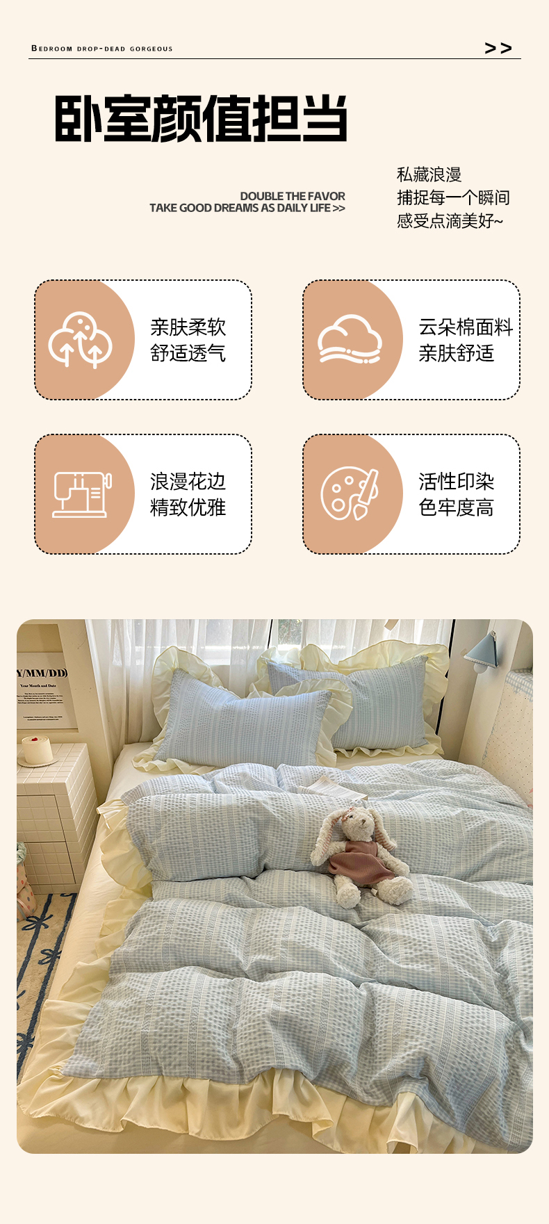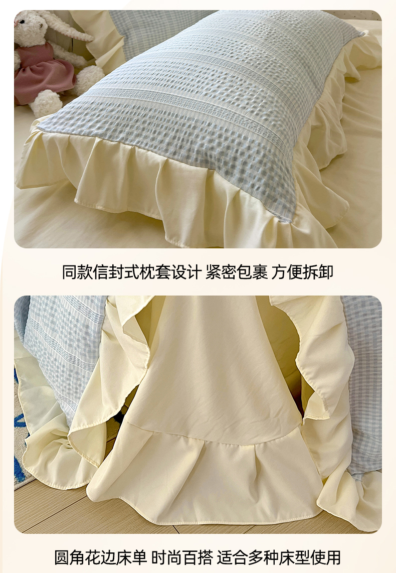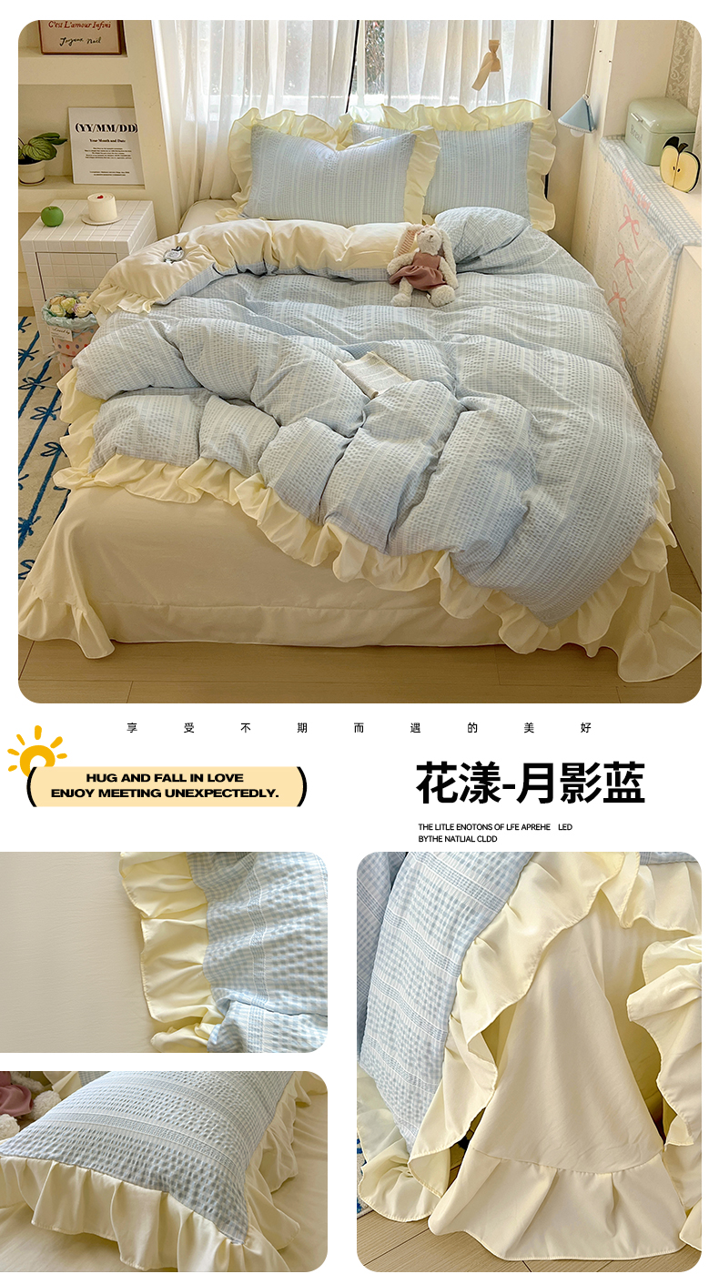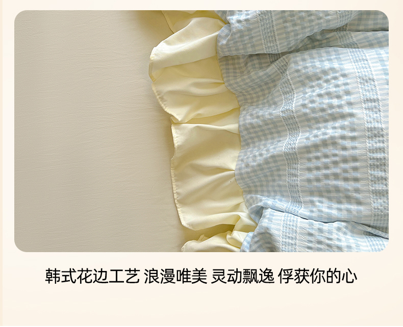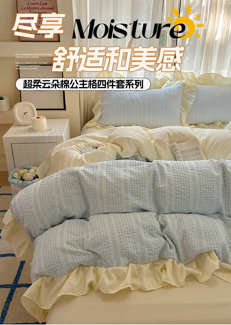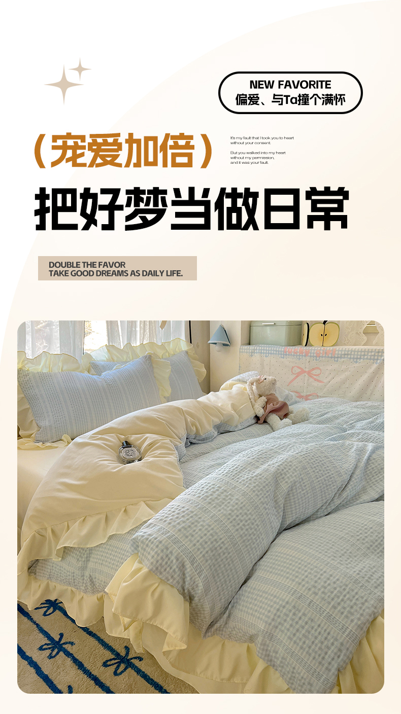 满座家居 2025直播爆款 韩版复古提花公主格四件套 亲肤云朵棉水洗棉四件套 花漾-月影蓝