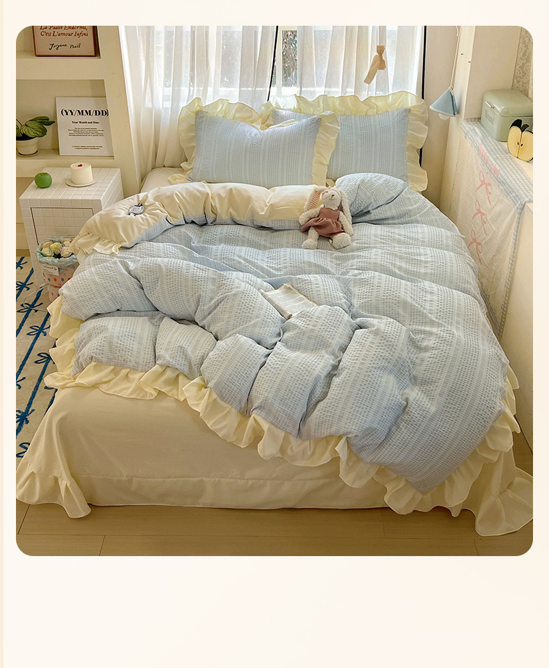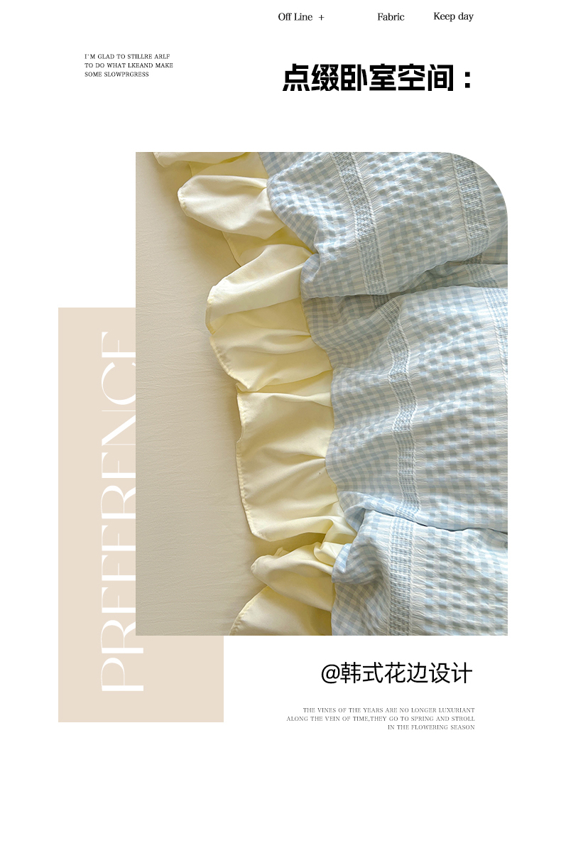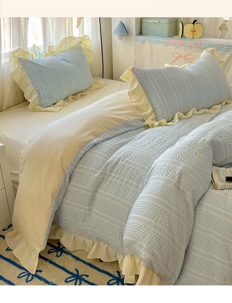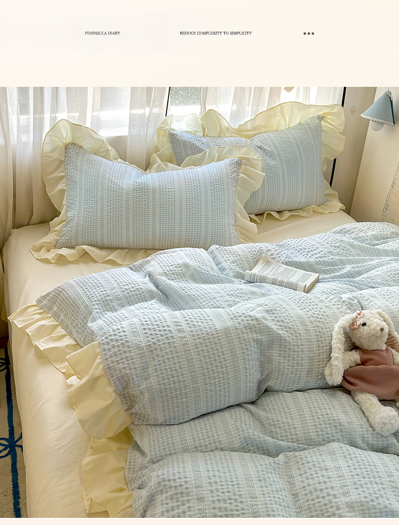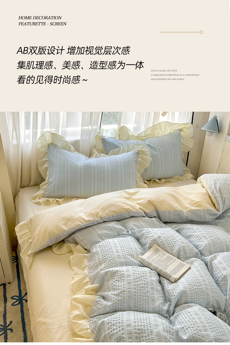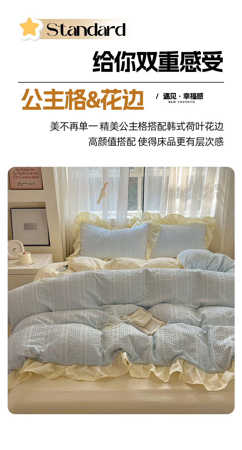 满座家居 2025直播爆款 韩版复古提花公主格四件套 亲肤云朵棉水洗棉四件套 花漾-月影蓝
