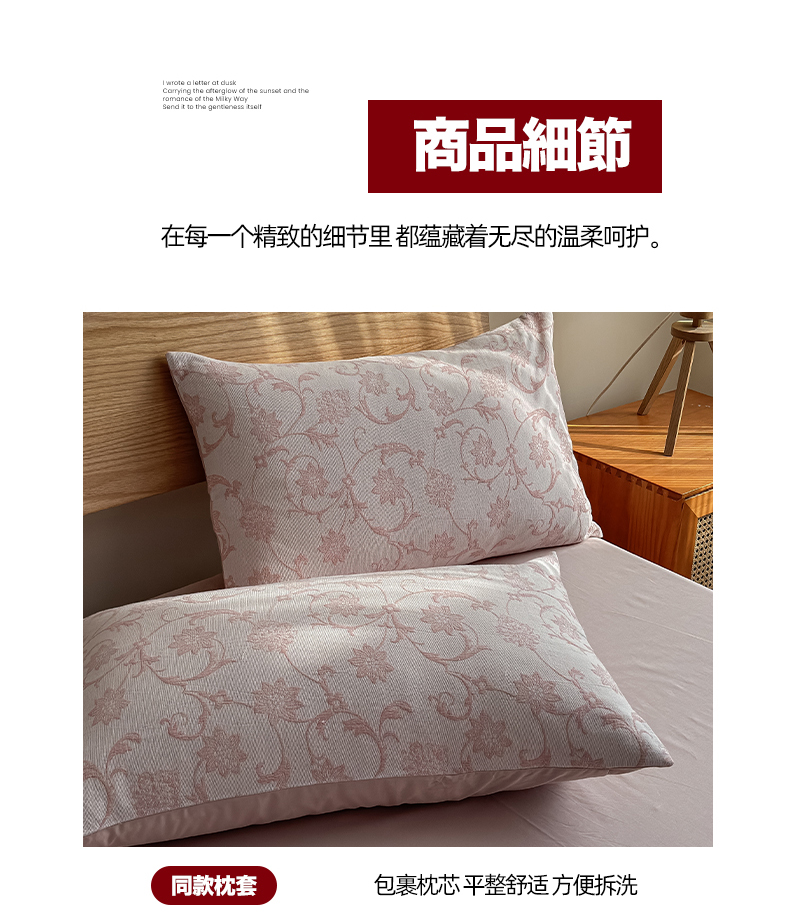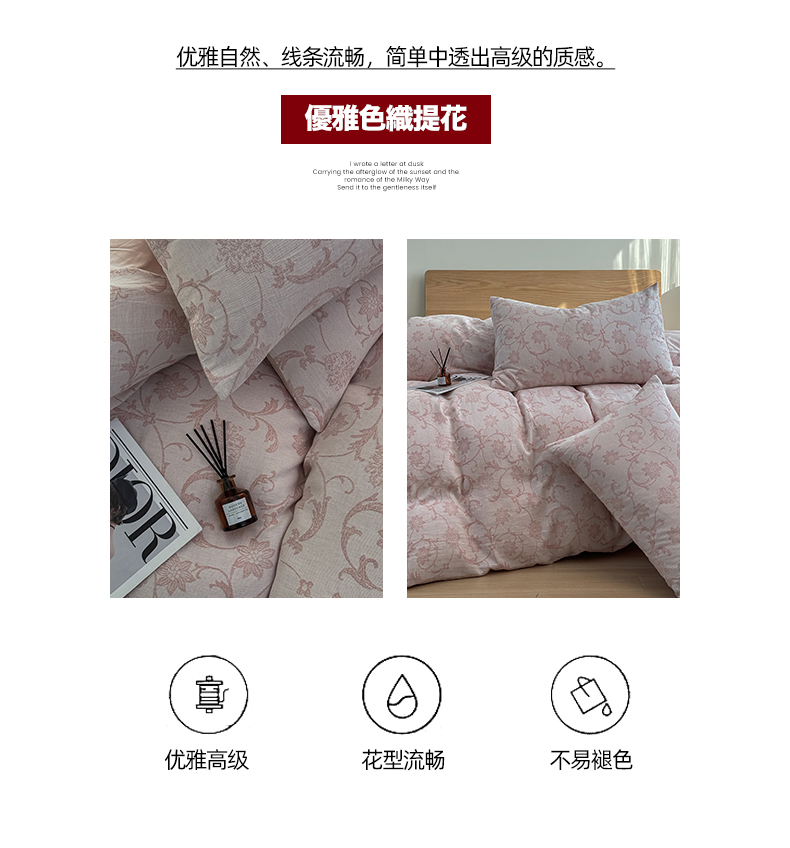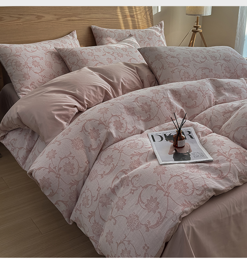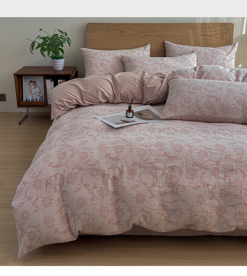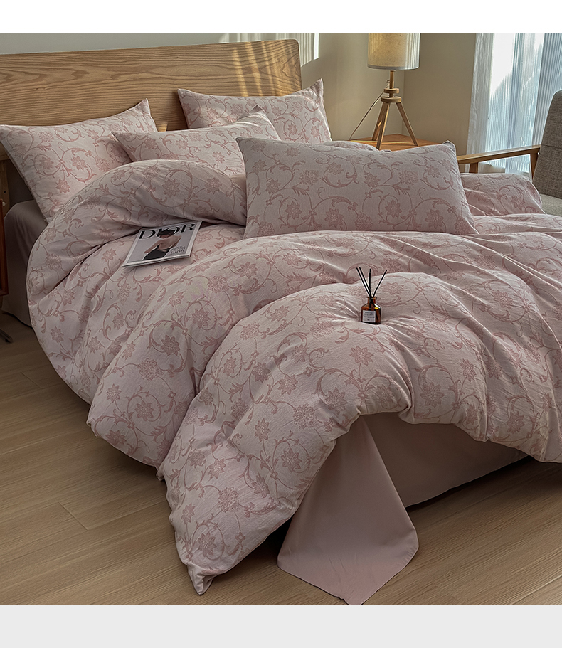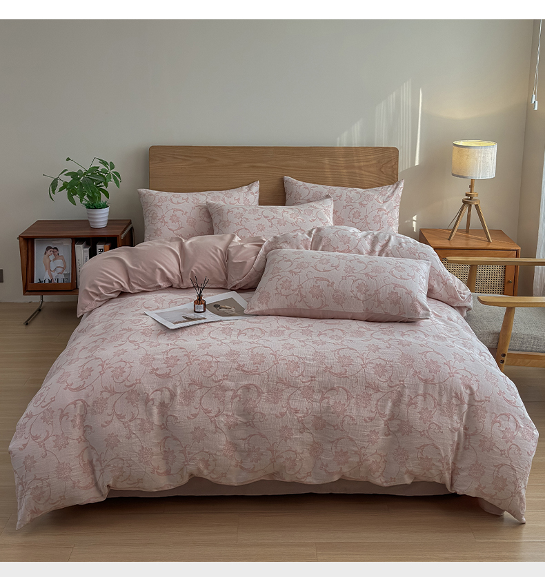 商品名称:莱茵家居 2025春夏新款A类三层纱色织提花全棉四件套 花蔓粉