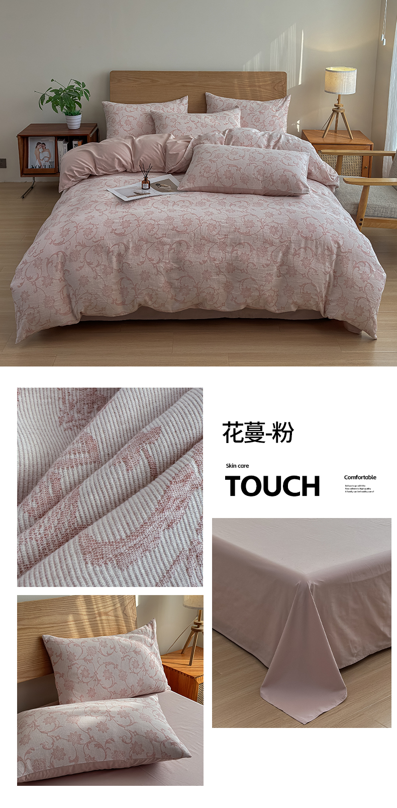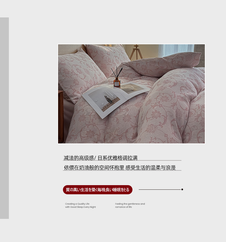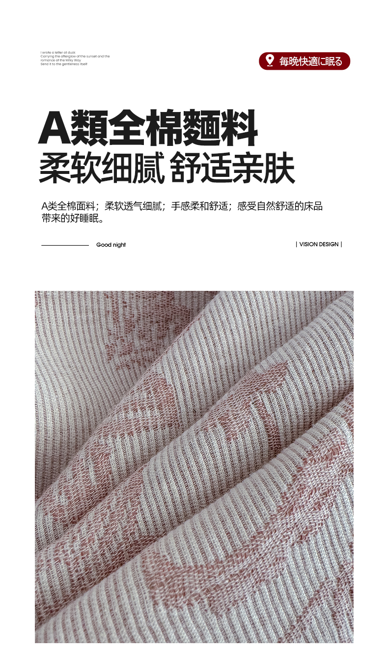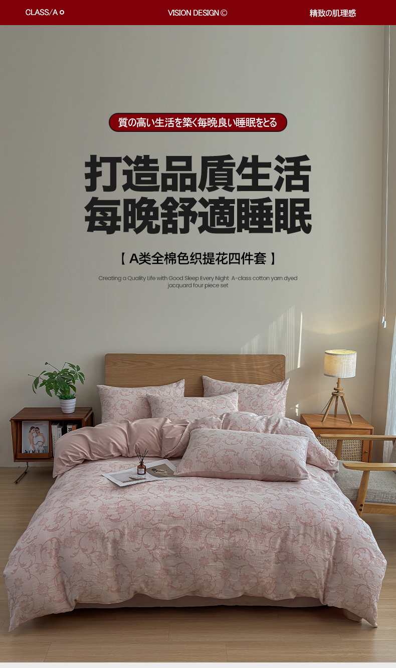 商品名称:莱茵家居 2025春夏新款A类三层纱色织提花全棉四件套 花蔓粉