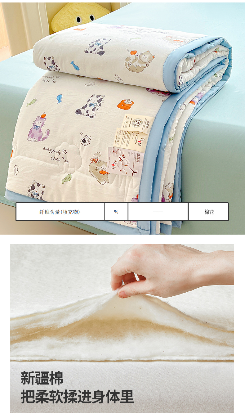 商品名称: 2025新款A类新疆棉花夏凉被加宽包边水洗棉卡通印花吸湿透气棉花夏被空调被 凌香 许愿猫
