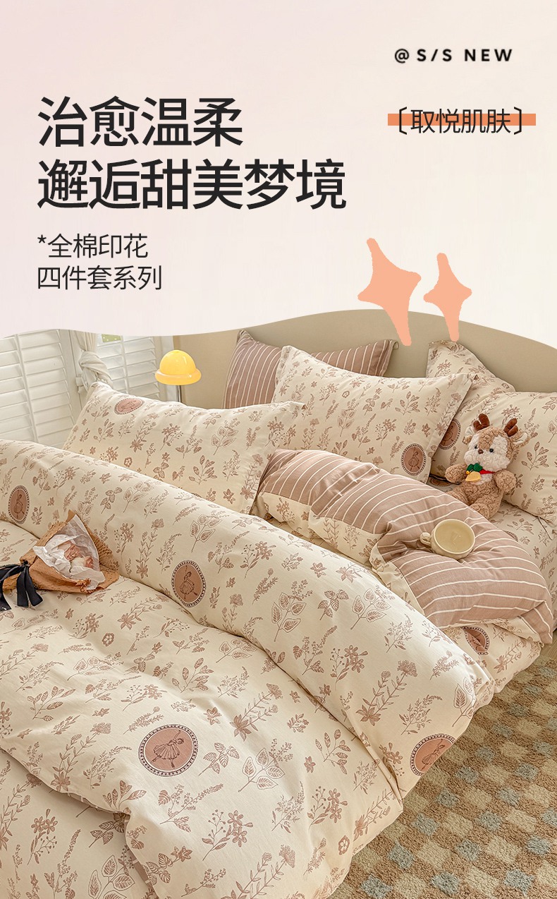 (总)绵庭家纺 2023新款12868系列全棉小清新印花四件套,半夏花语,波比兔,初晴花语,丁香兔,荷花映红,可爱小象,恐龙贝贝,梅林春晓,茉莉幻想,皮皮兔,清风絮语,森林狂欢,香草之恋,雅卉,玉芙蓉 豆沙