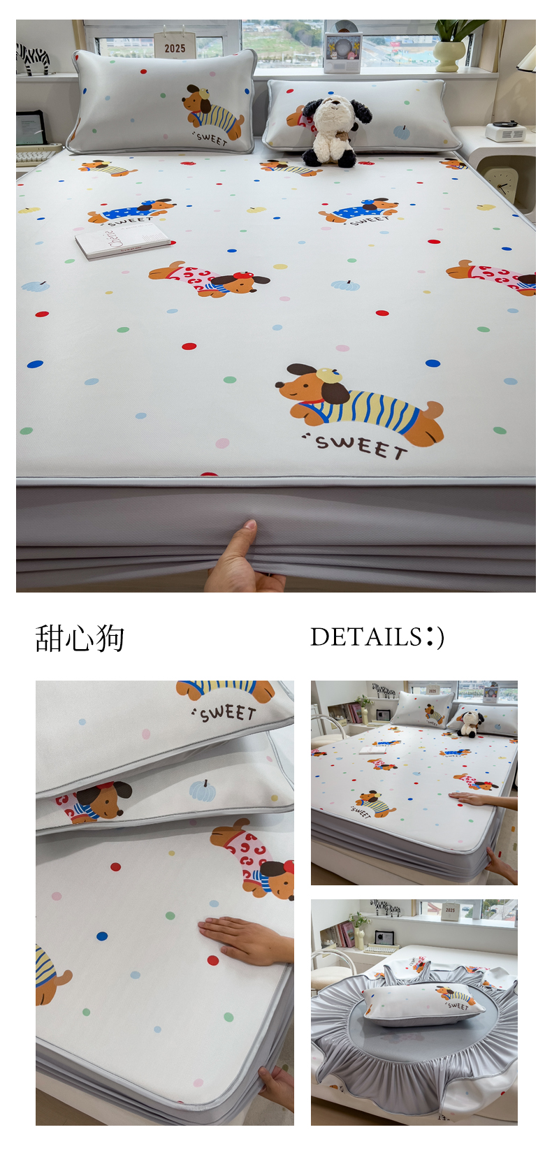 商品名称:丝羽坊 2025新款小版印花冰丝凉席冰丝席碳光冰丝凉席-床笠款 甜心狗