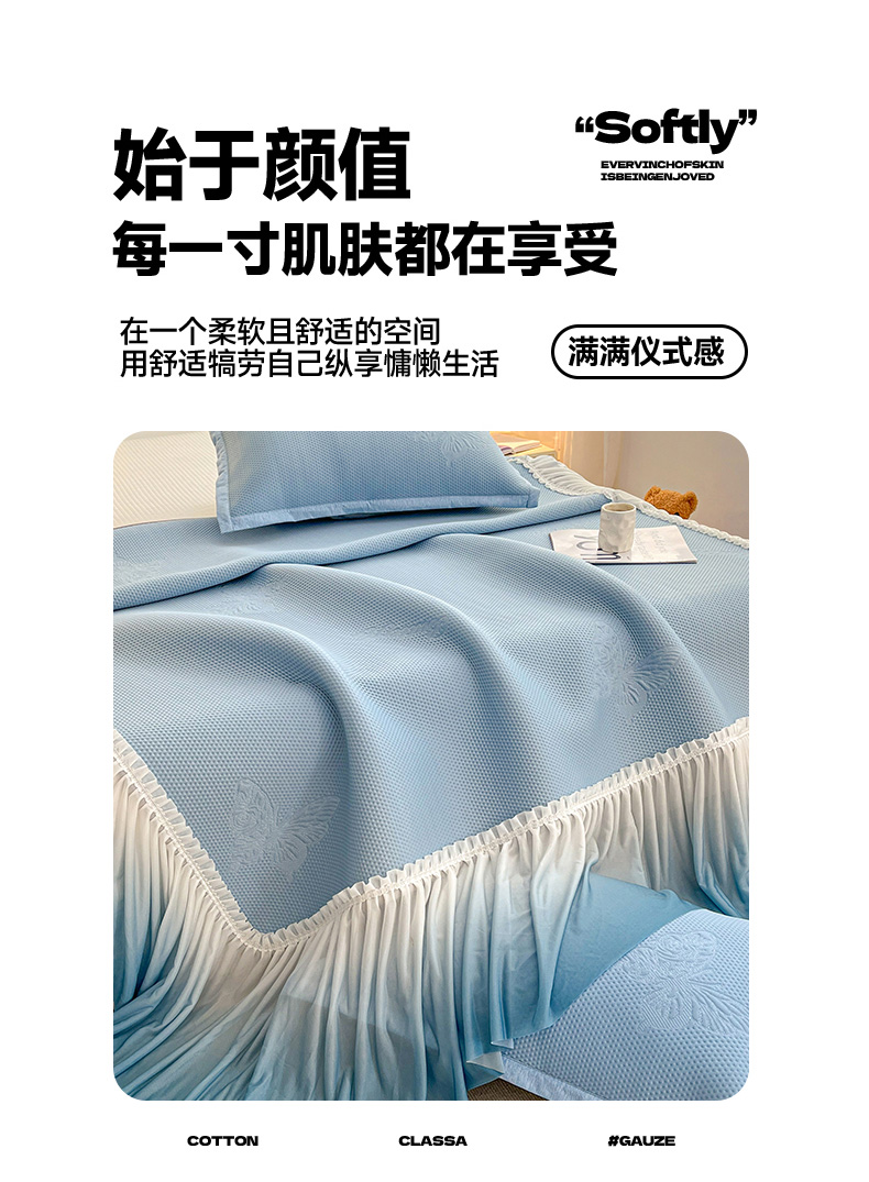 安哆啦家纺 2025新款凉感冰豆豆花边凉席三件套系列 豆豆床裙-深邃蓝