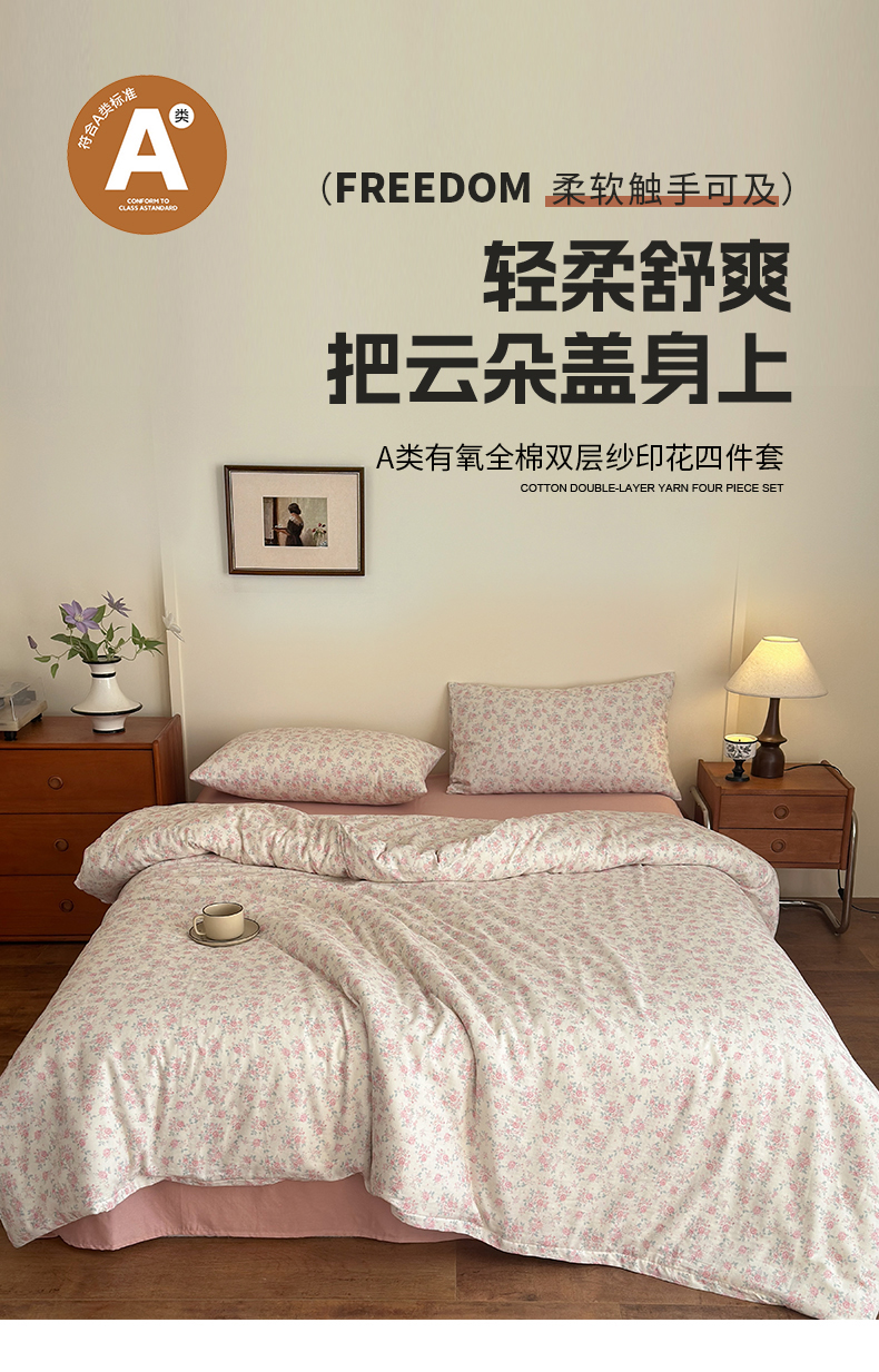 商品名称:曲之慕2025新款A类母婴级有氧全棉纯棉双层纱印花四件套 梅林春晓-米
