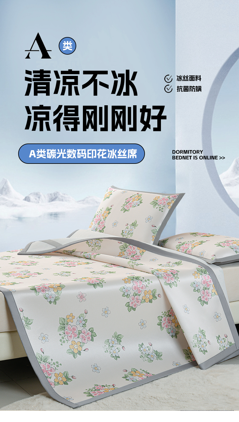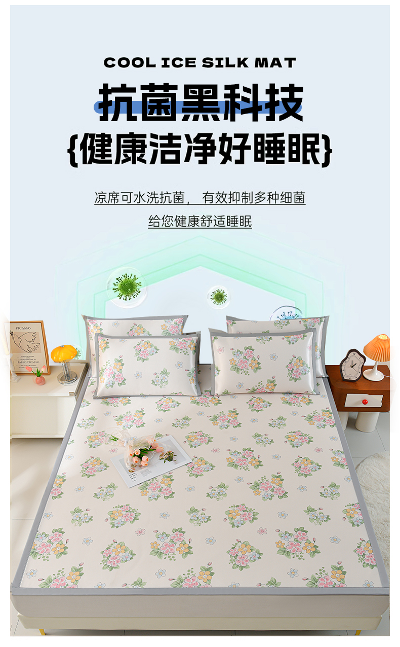 商品名称:简一 2025新款A类碳光印花数码冰丝凉席系列-床笠款 满园春色