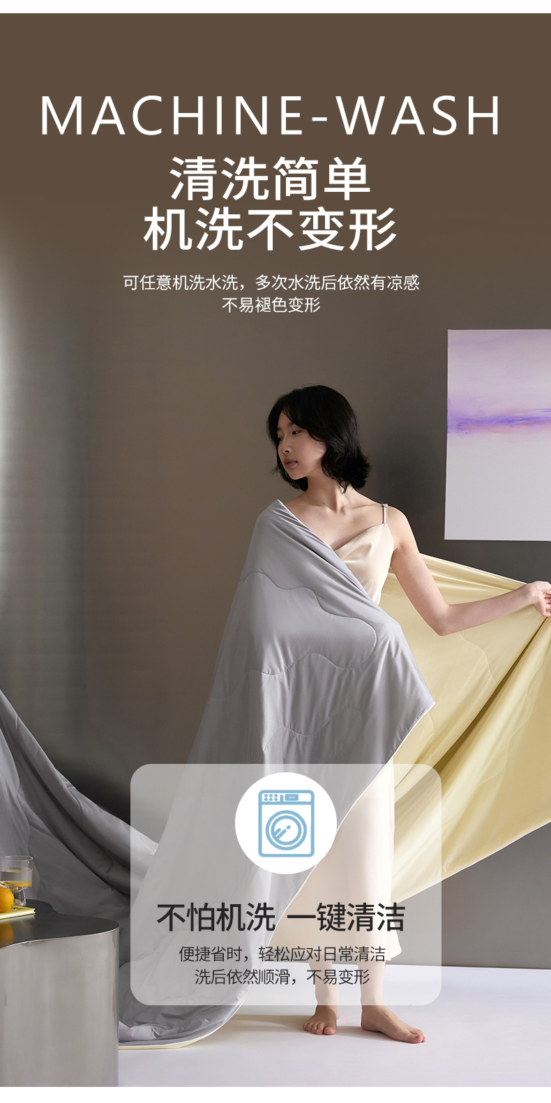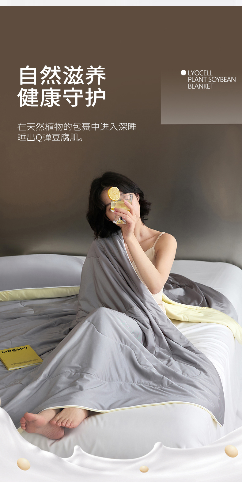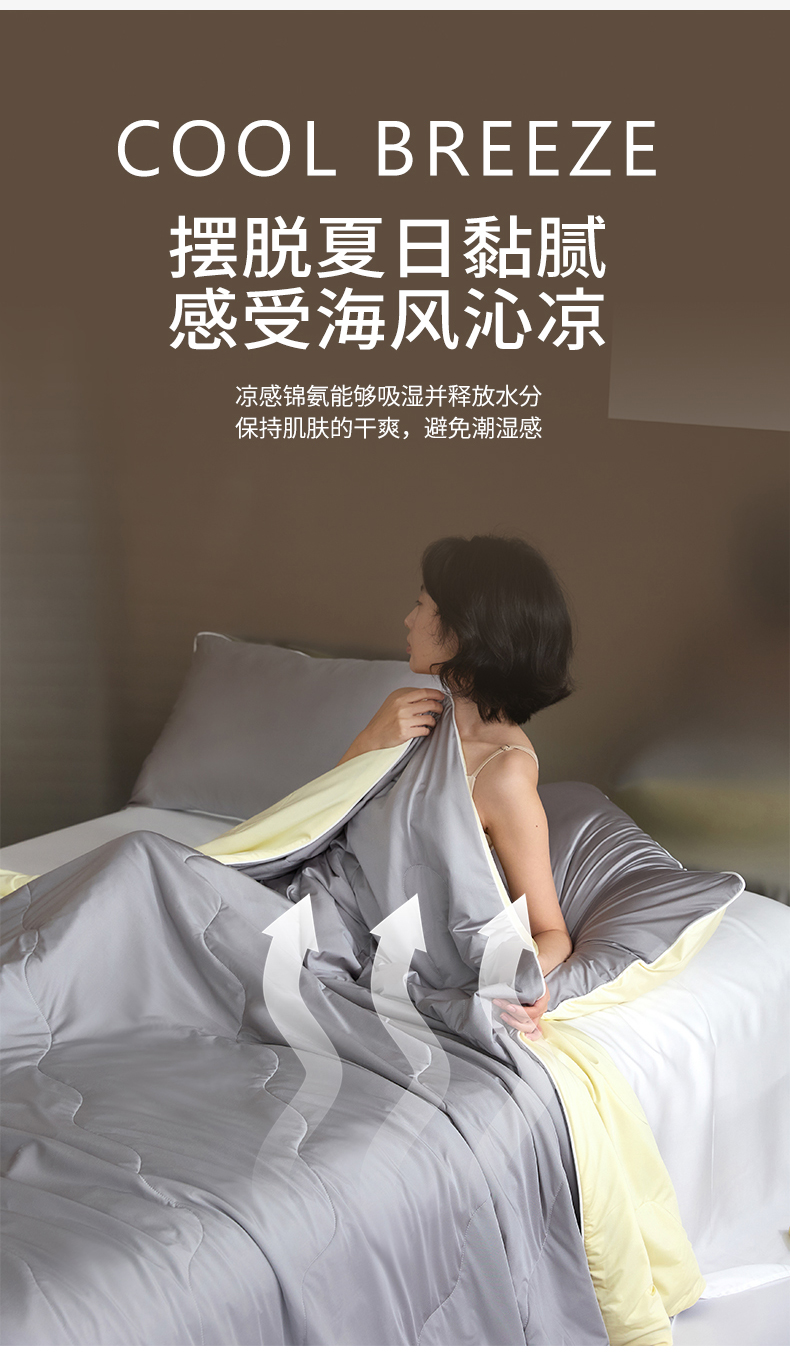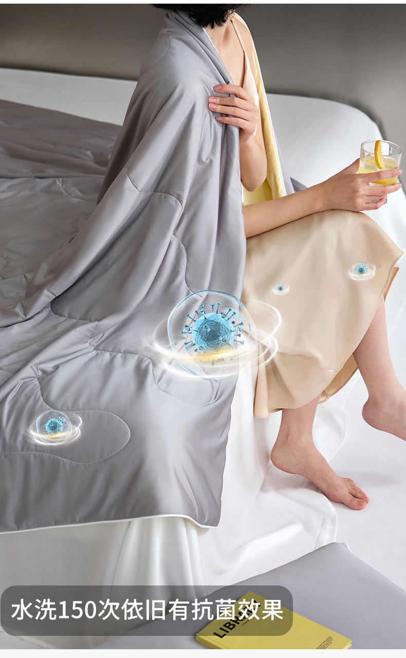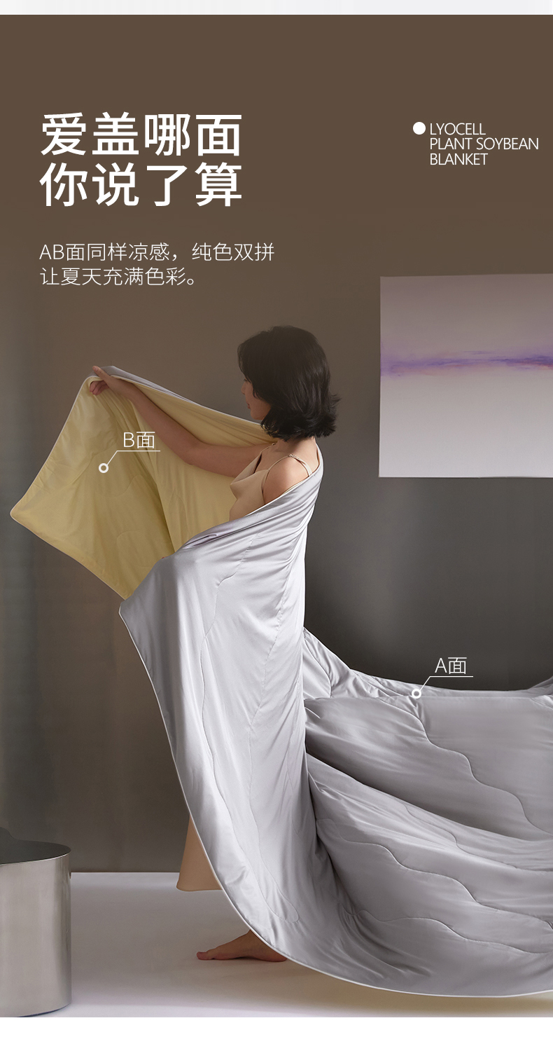 商品名称:头等舱 2025新款锦氨(165克)水光亮面锦A类55莱赛尔植物大豆7A抗菌夏凉被夏被(模特图) 幻影灰+奶黄