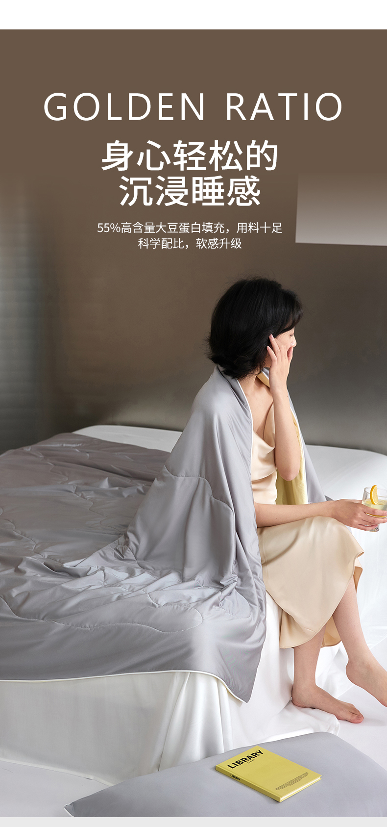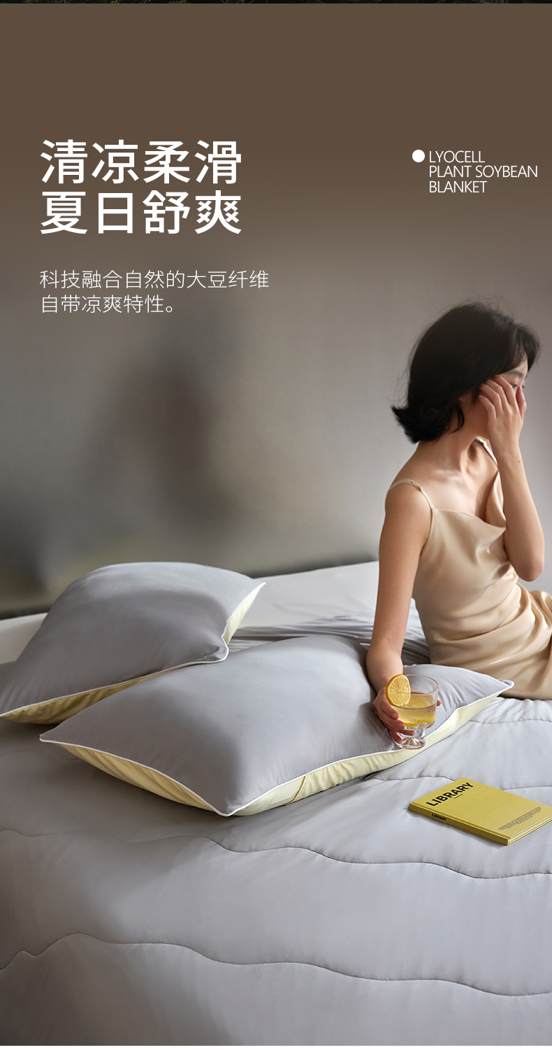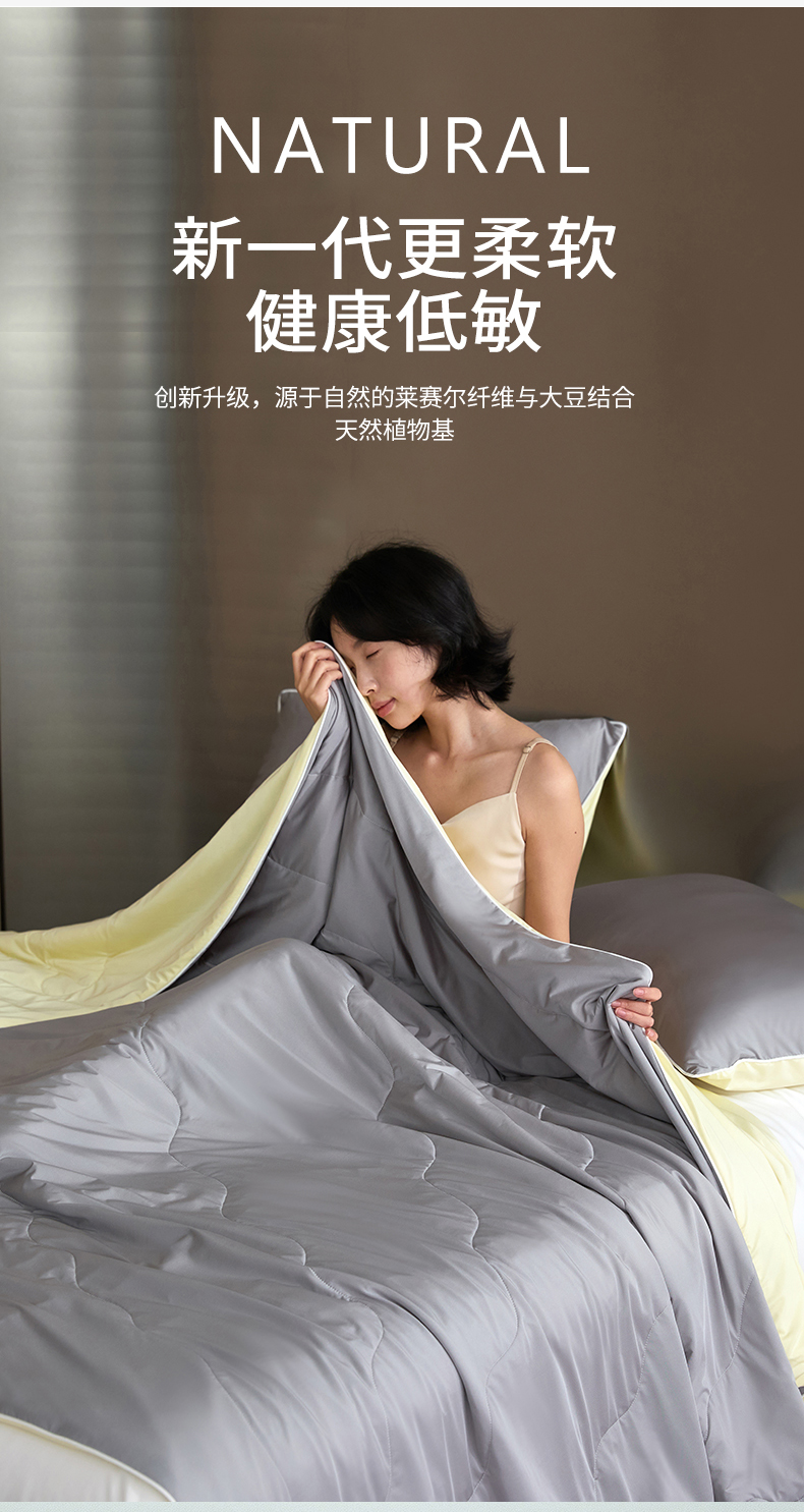 被子 > 夏被 > 头等舱 2025新款锦氨(165克)水光亮面锦A类55莱赛尔植物大豆7A抗菌夏凉被夏被(模特图) 幻影灰+奶黄