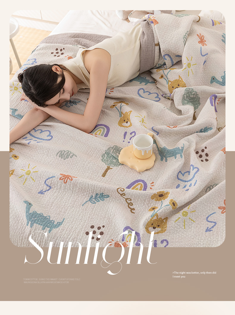 (总)乐家毛巾被(工厂自产自销) 2025新款A类全棉六层纱印花毛巾被,白色棉朵,彩蝶,彩虹小熊,动物派对,多彩南瓜,格子花花,黄油小熊,简笔森林,卡通狗狗,绿色茶花,莫比乌斯环,水墨花开,兔子小狗,吴丹花开,向日葵,尤加利,油画雏菊,happy腊肠狗