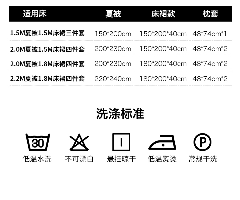 1.5米夏被1.5米床裙三件套(夏被150*200cm,床裙150*200cm(高度40cm)枕套48*74*1) | ¥100.00 |