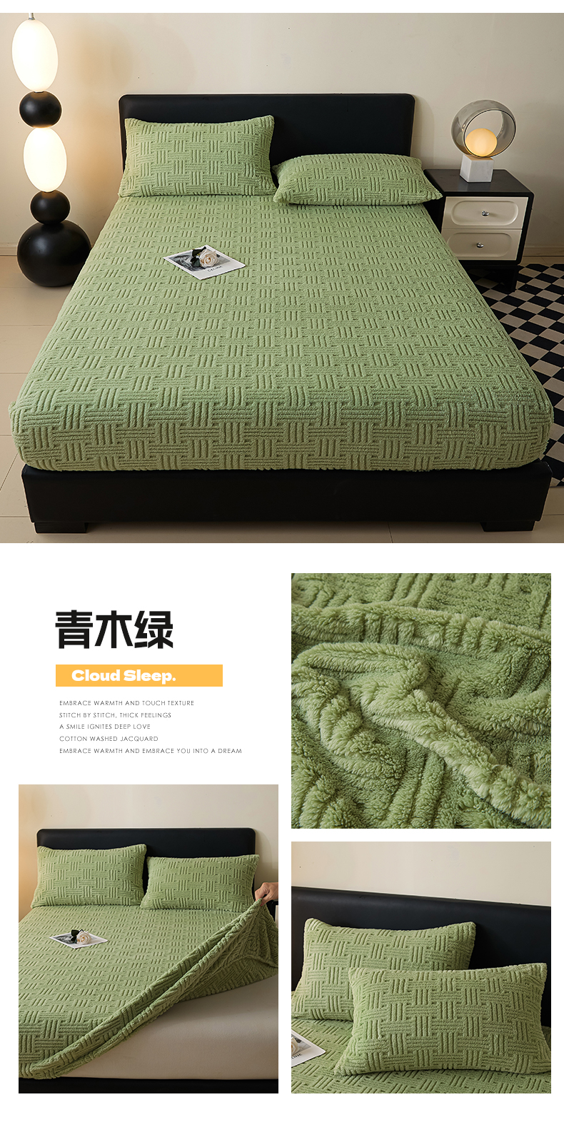 • 91家纺网 家纺一手货源 找家纺 欧邦2025新款提花舒棉绒塔芙绒床笠跨境-场景一 青木绿