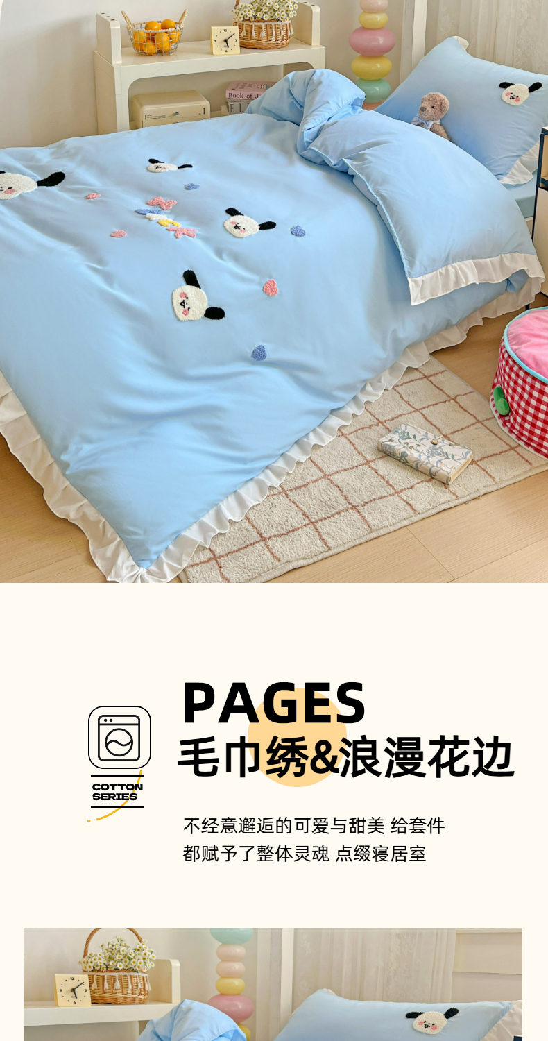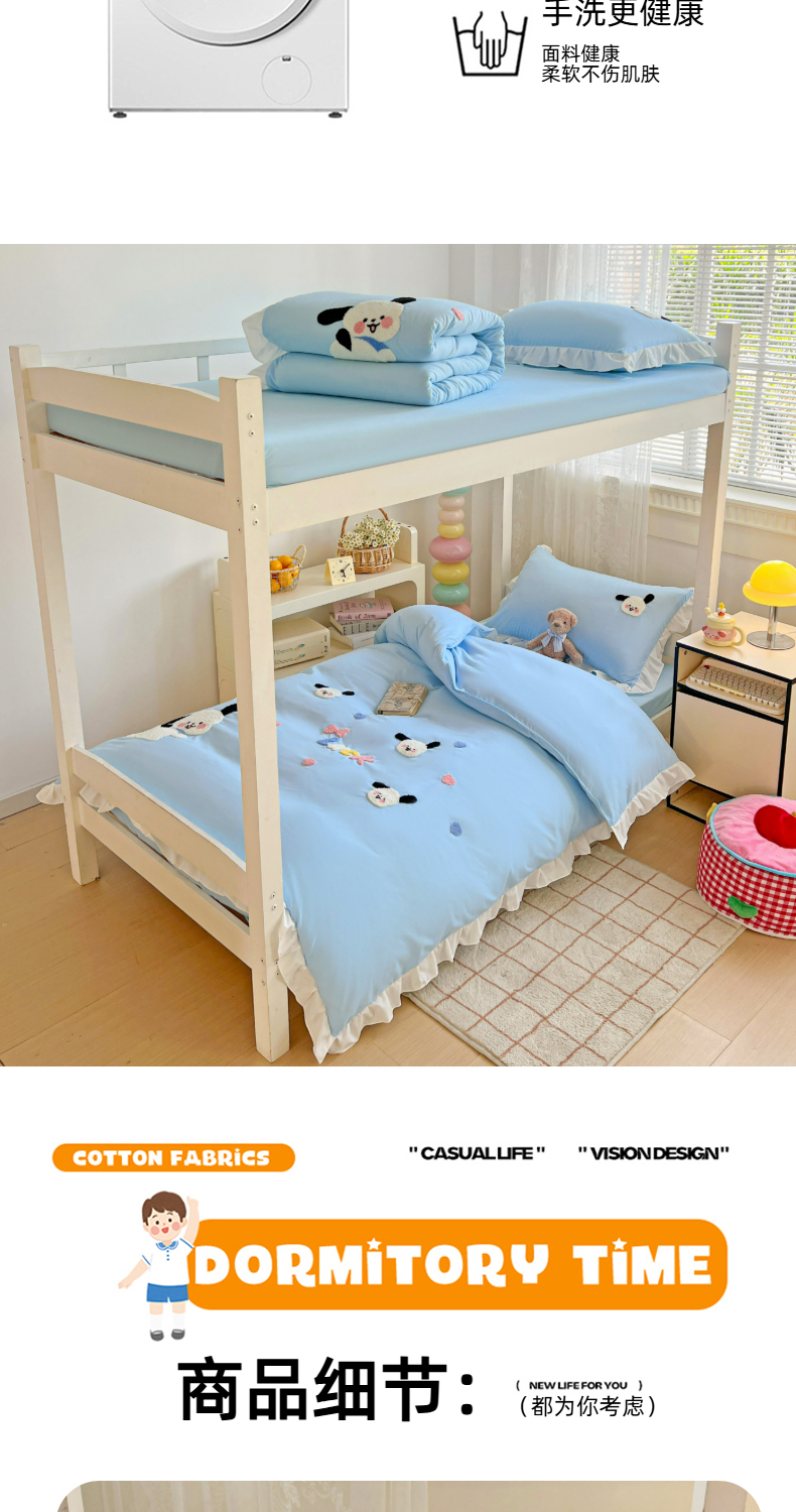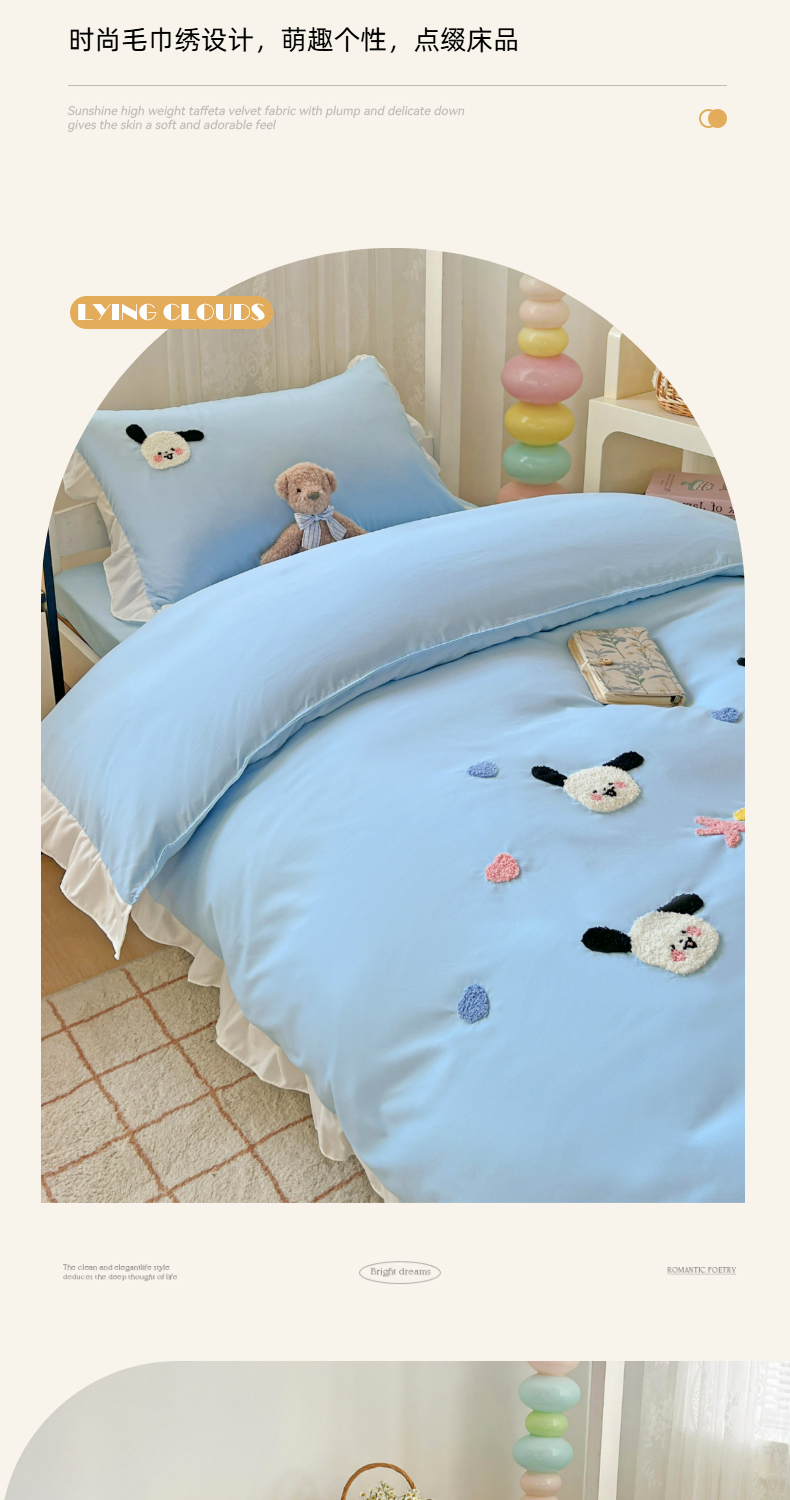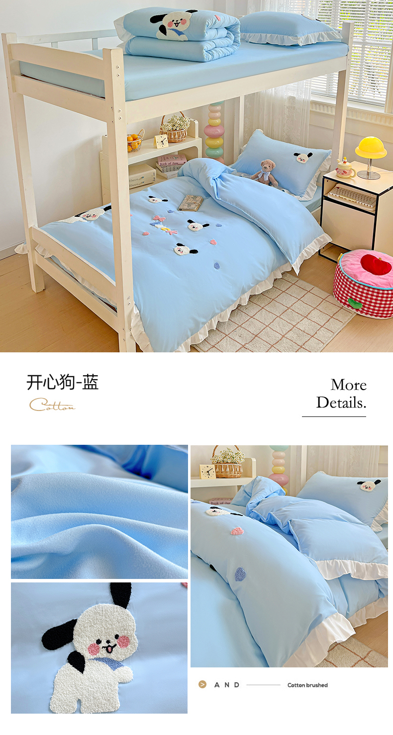 当前位置: 91家纺网 > 商品网购 > 床品套件 > 三件套 > 雨菲家纺 2025新款学生季水洗棉毛巾绣花荷叶花边三件套四件套床单床笠款 开心狗蓝