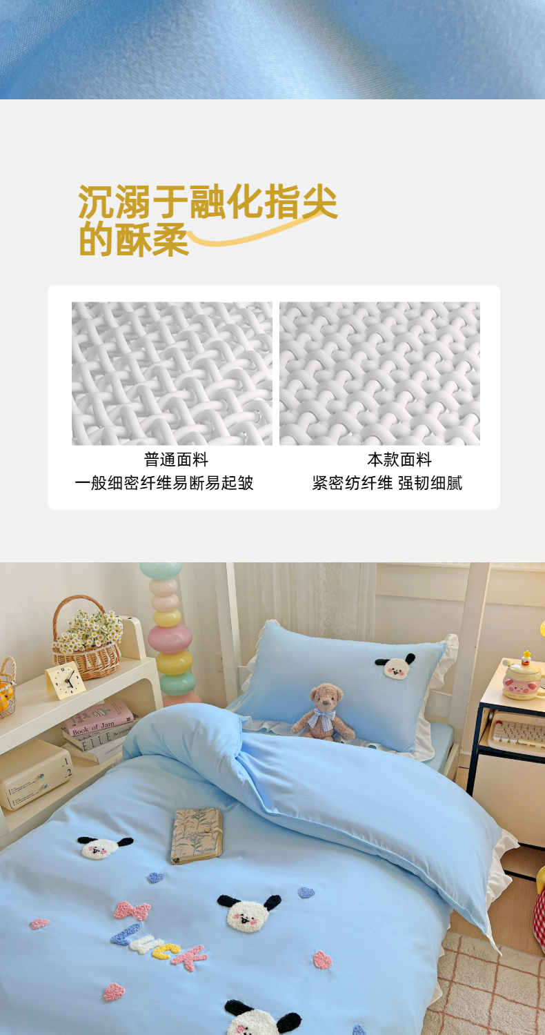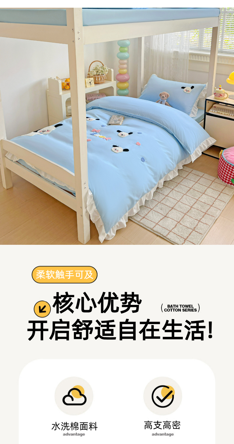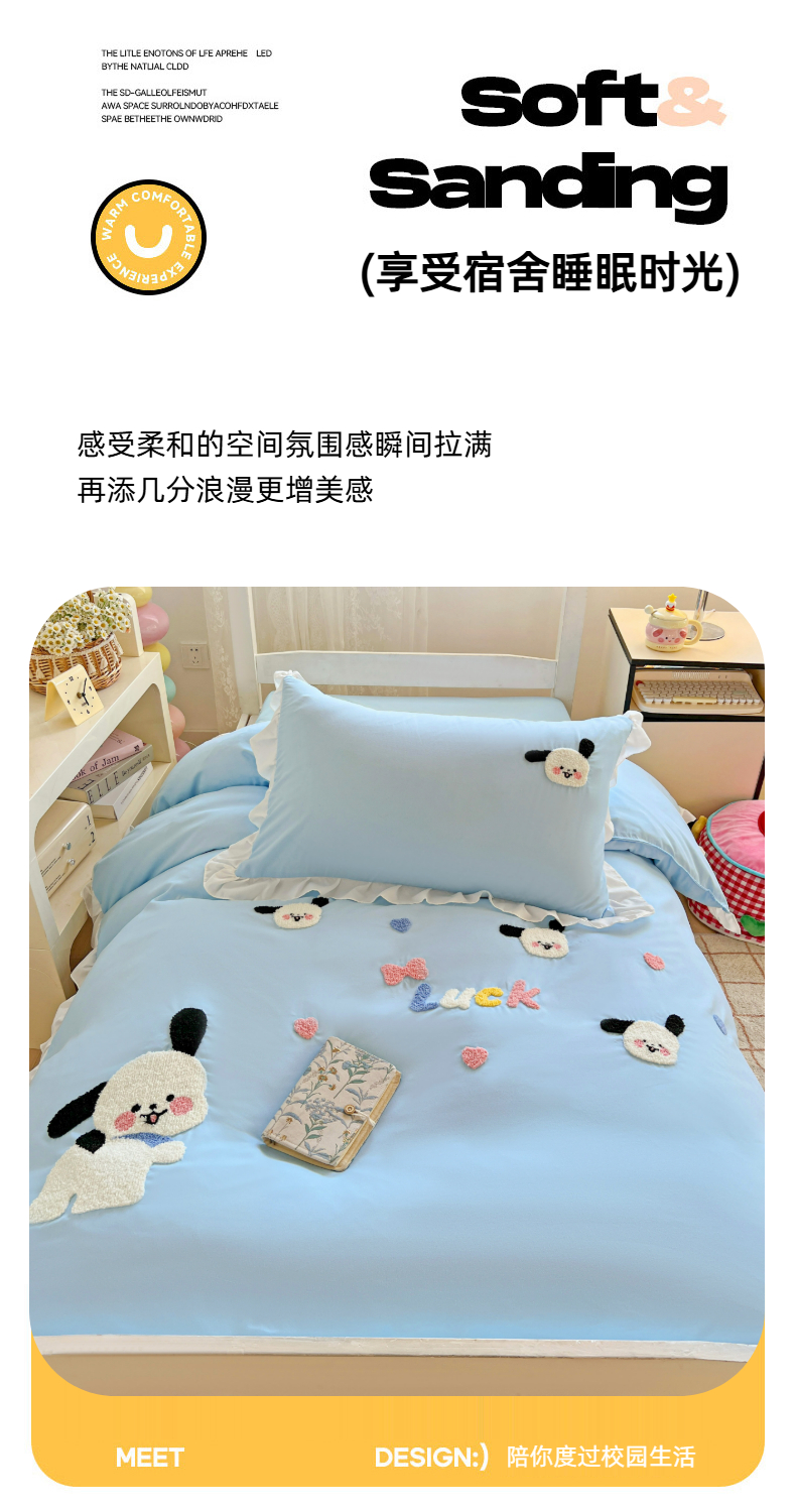 当前位置: 91家纺网 > 商品网购 > 床品套件 > 三件套 > 雨菲家纺 2025新款学生季水洗棉毛巾绣花荷叶花边三件套四件套床单床笠款 开心狗蓝