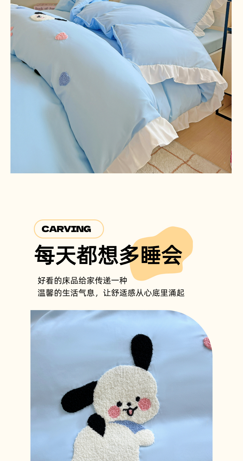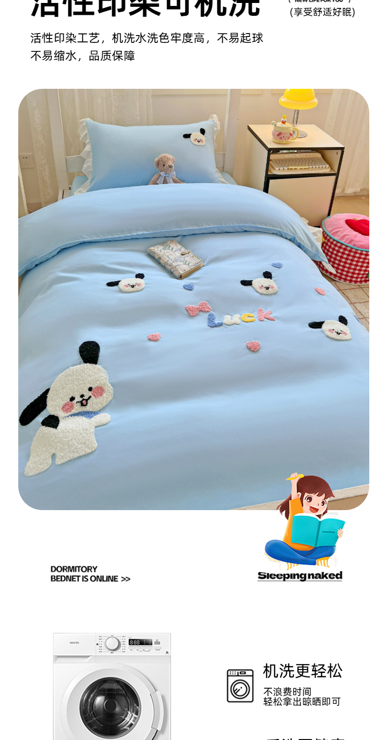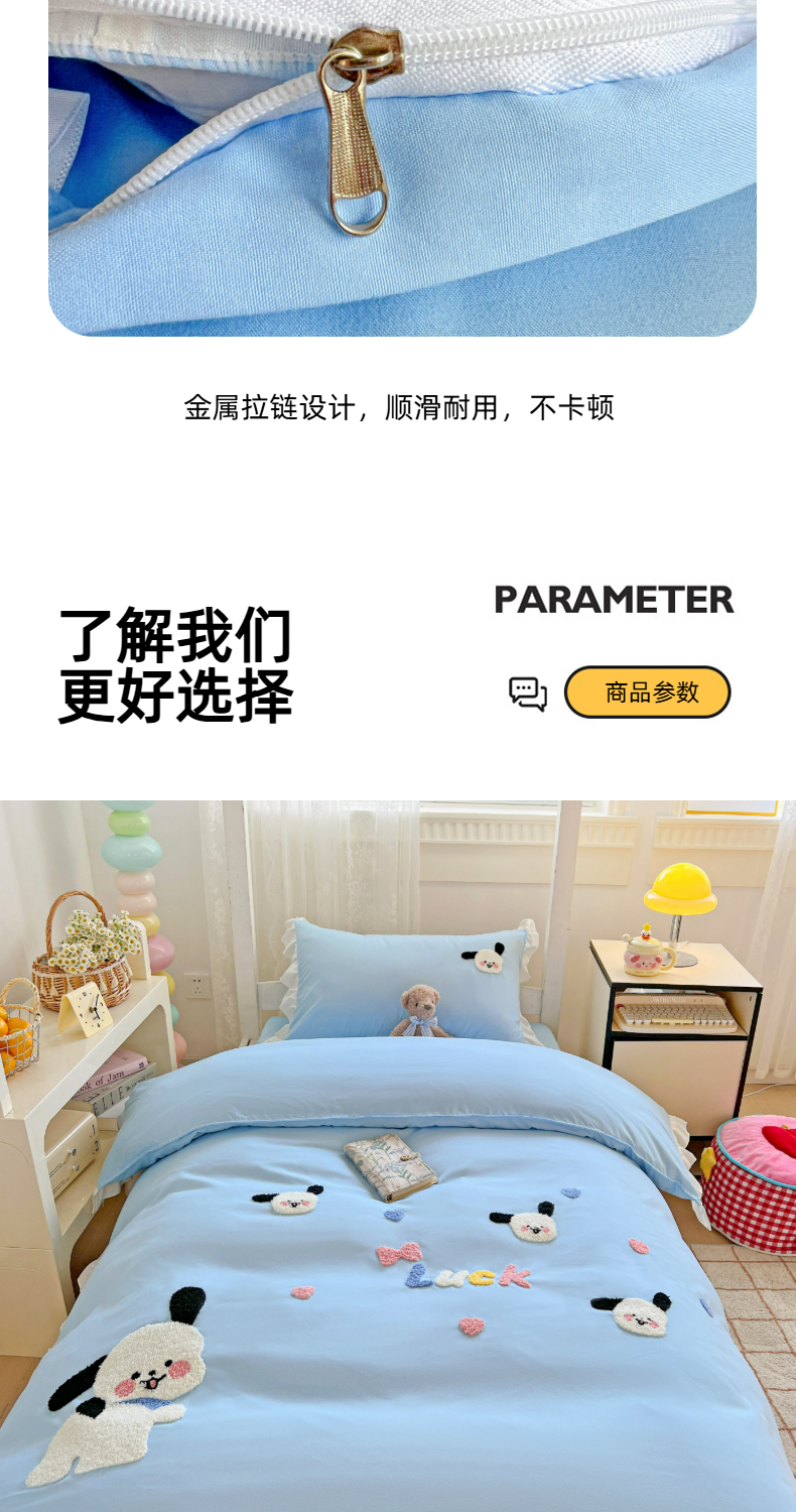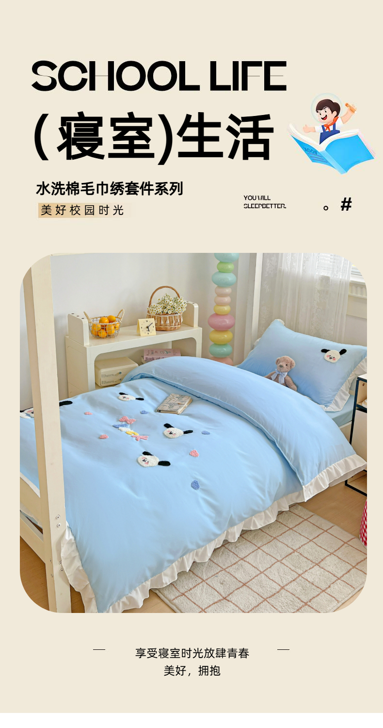 当前位置: 91家纺网 > 商品网购 > 床品套件 > 三件套 > 雨菲家纺 2025新款学生季水洗棉毛巾绣花荷叶花边三件套四件套床单床笠款 开心狗蓝