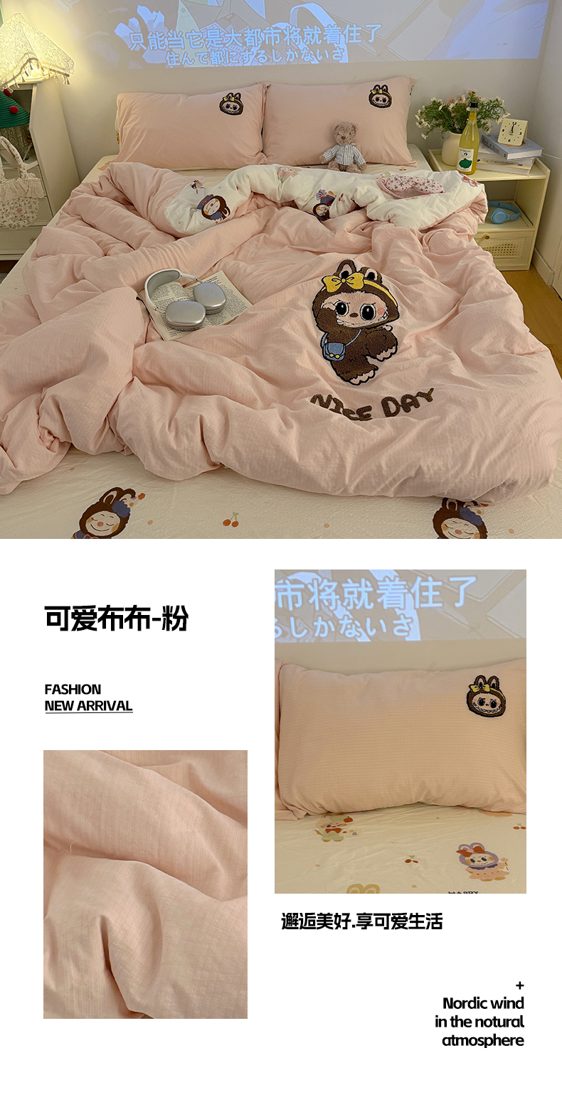 当前位置: 91家纺网 > 商品网购 > 床品套件 > 四件套 > 双层纱四件套 > 罗亿家纺 2025新款云感双层纱卡通毛巾绣四件套(拉布布系列场景一) 可爱布布-粉