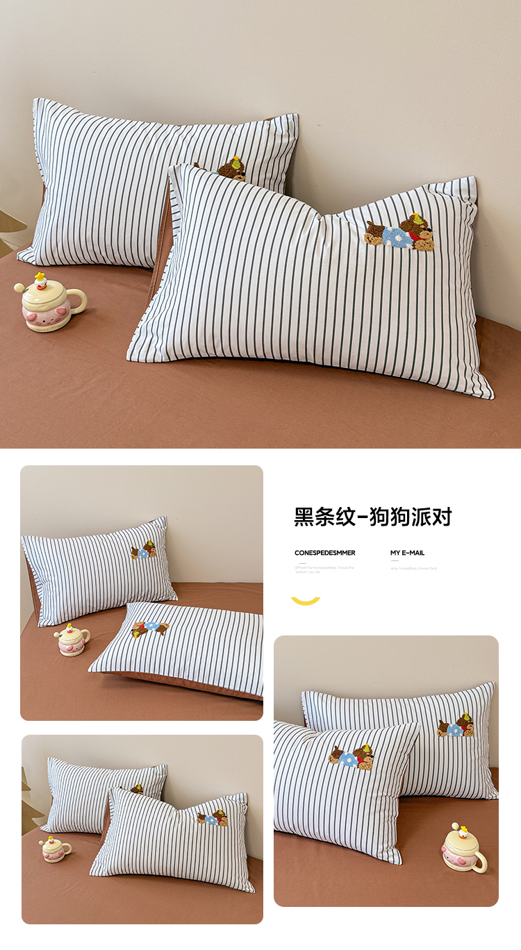 商品名称:呗旺鹿 2025新款全棉纯棉条纹毛巾绣卡通单枕套 枕套单件 黑条纹-狗狗派对