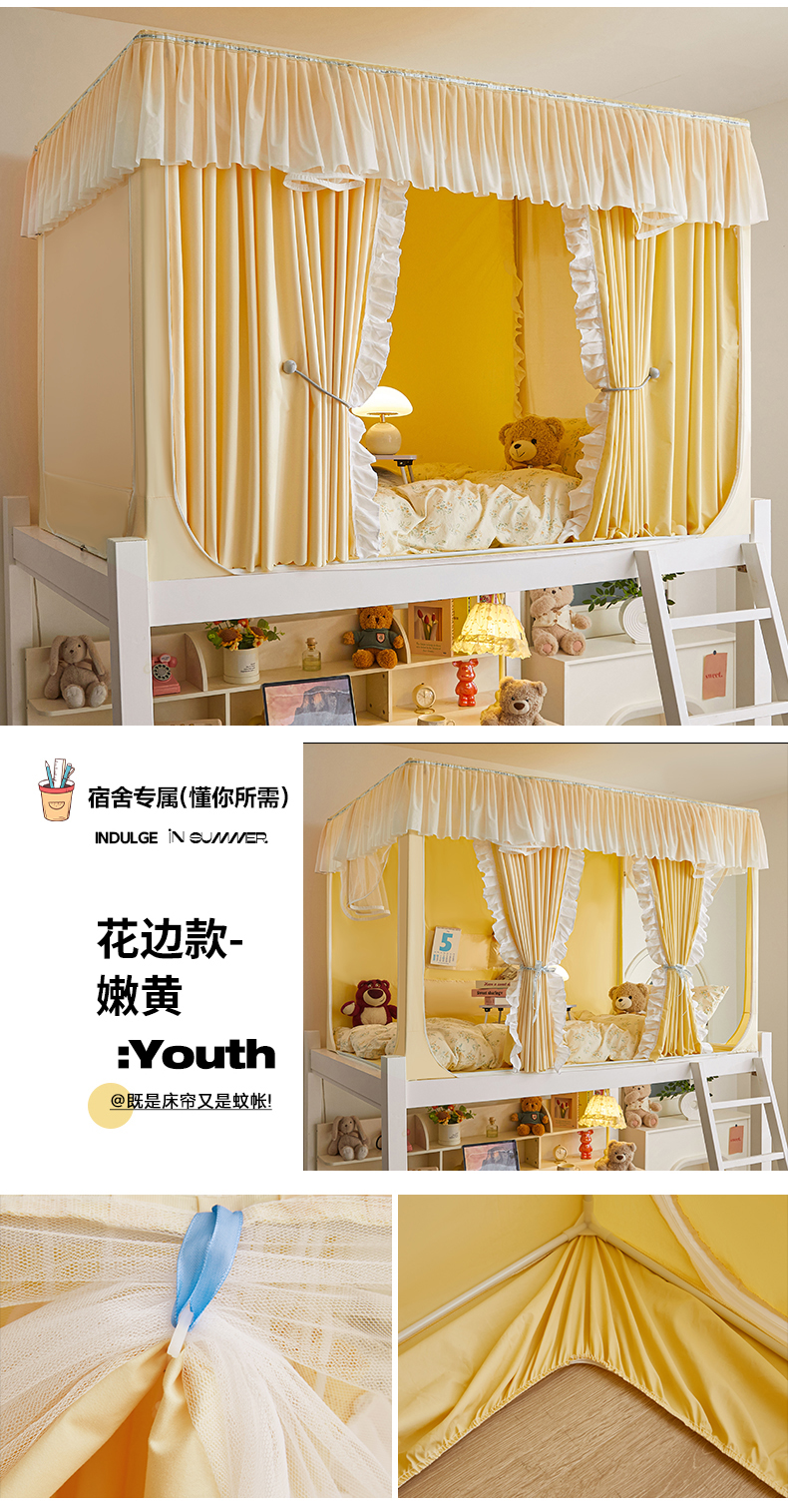 商品名称:锦逸家居 2025新款渐变花边款遮光学生蚊帐 渐变花边-嫩黄