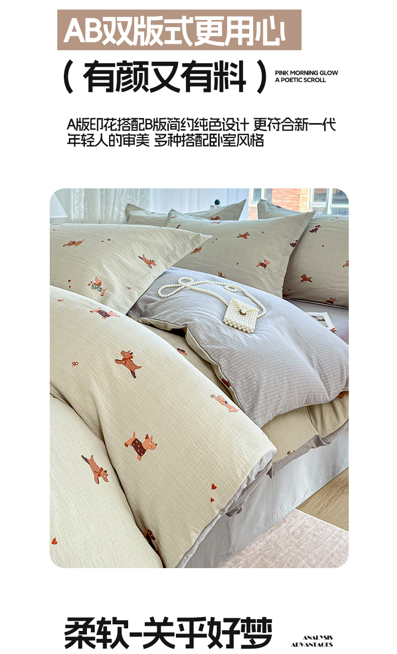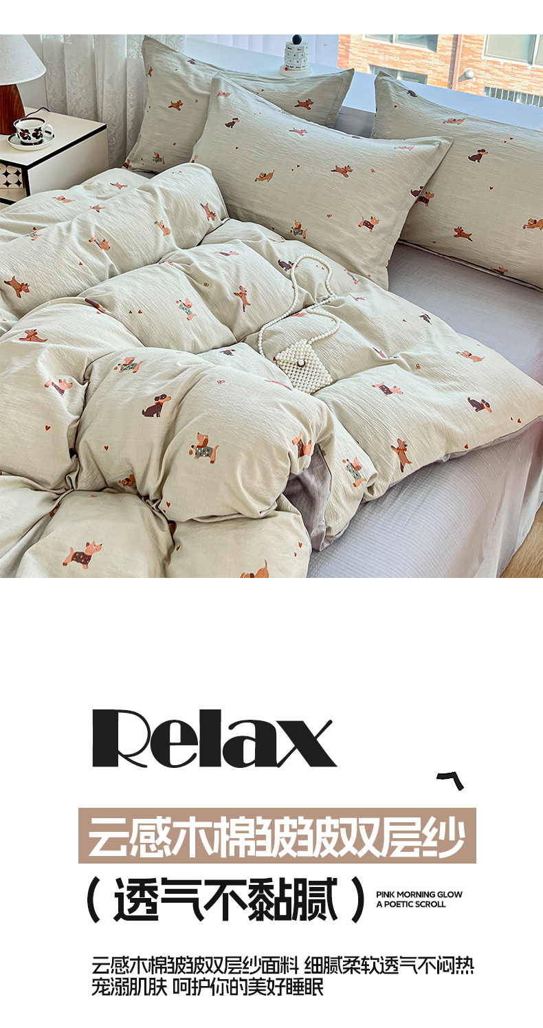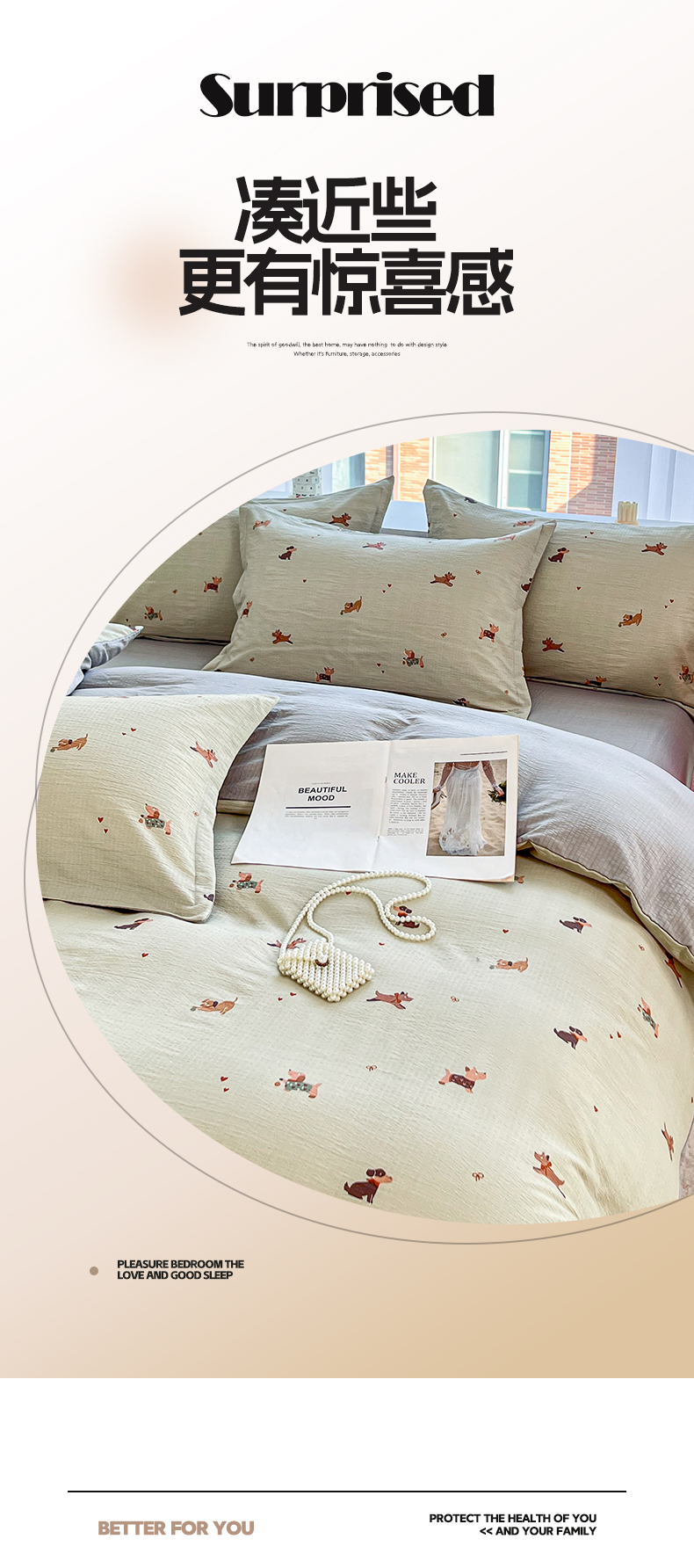 麦田家纺 2025新款A类云感木棉皱皱双层纱印花四件套 腊肠犬