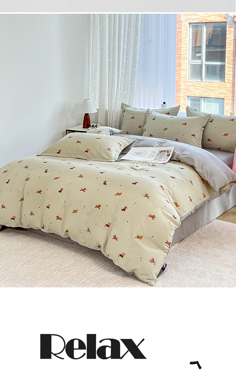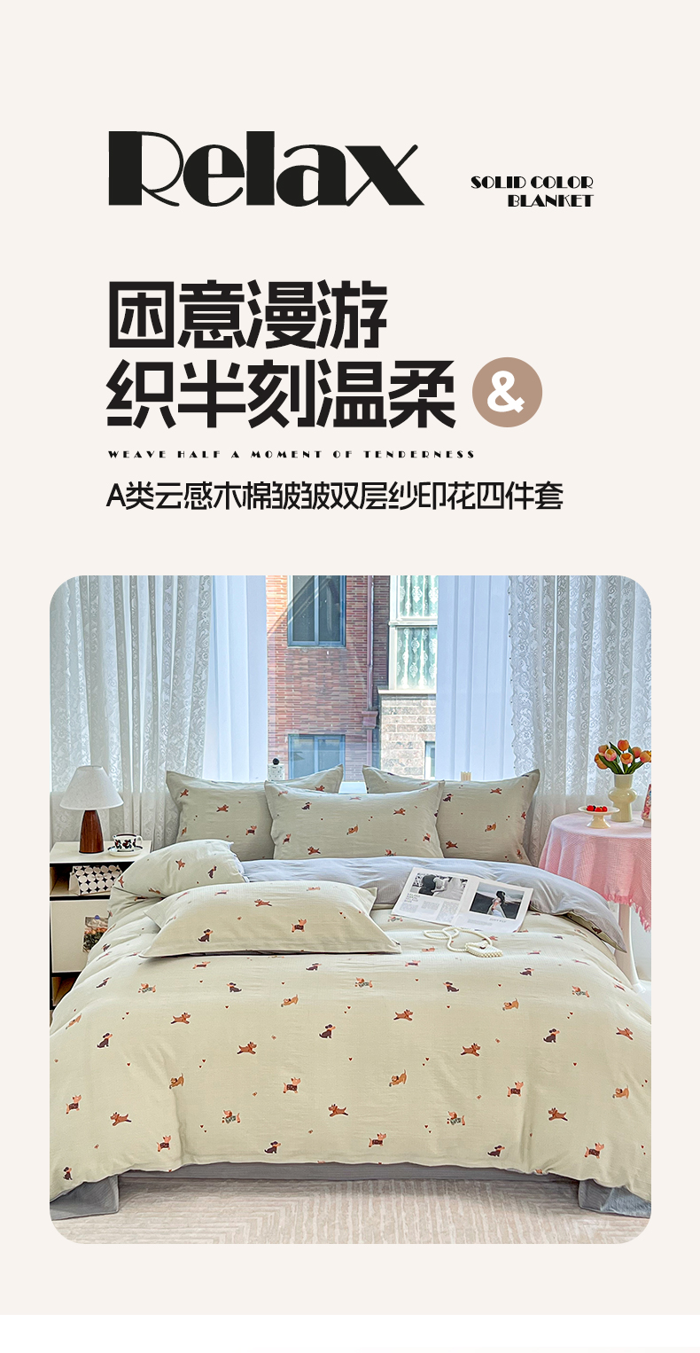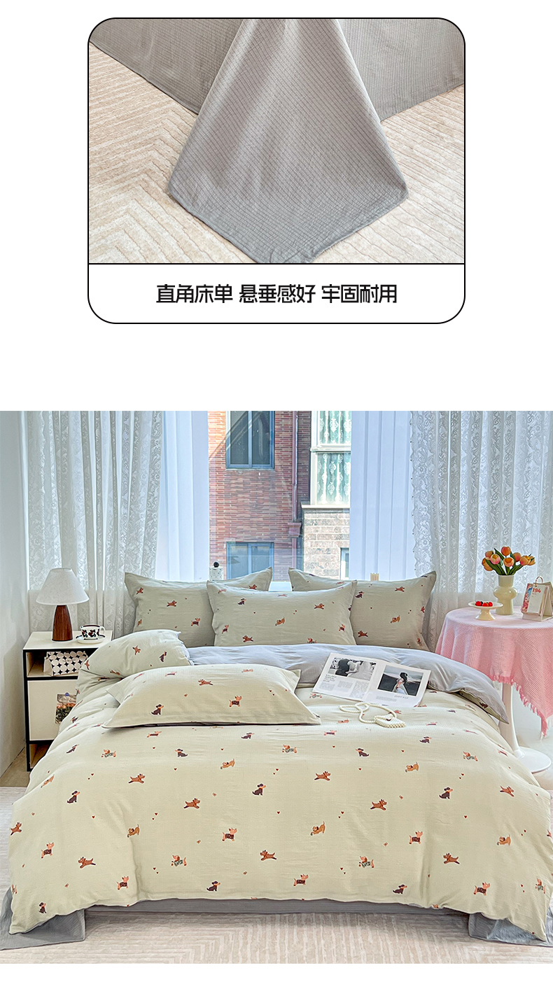 麦田家纺 2025新款A类云感木棉皱皱双层纱印花四件套 腊肠犬