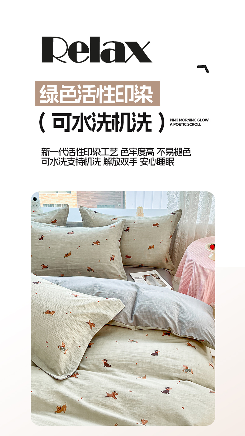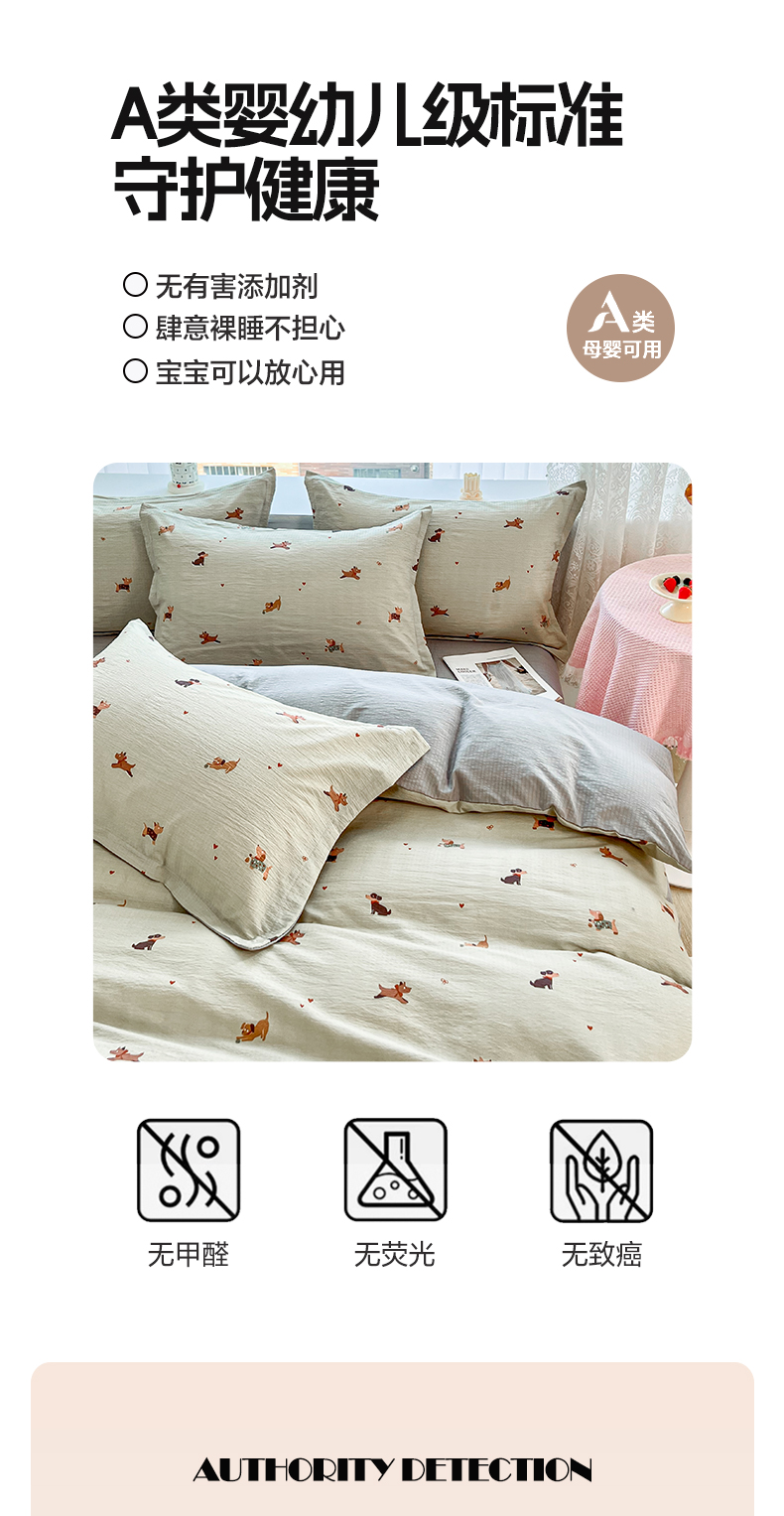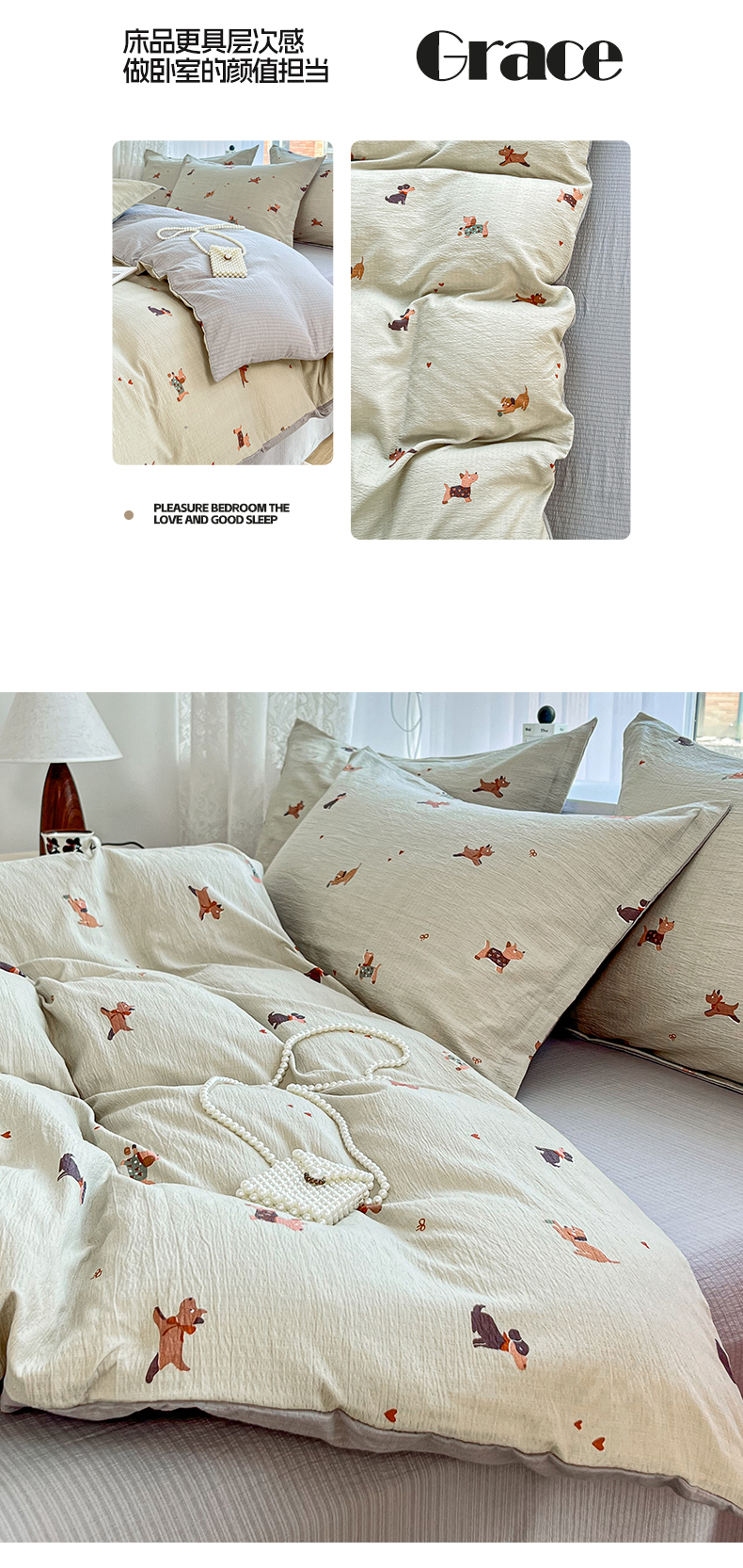 商品名称:麦田家纺 2025新款A类云感木棉皱皱双层纱印花四件套 腊肠犬