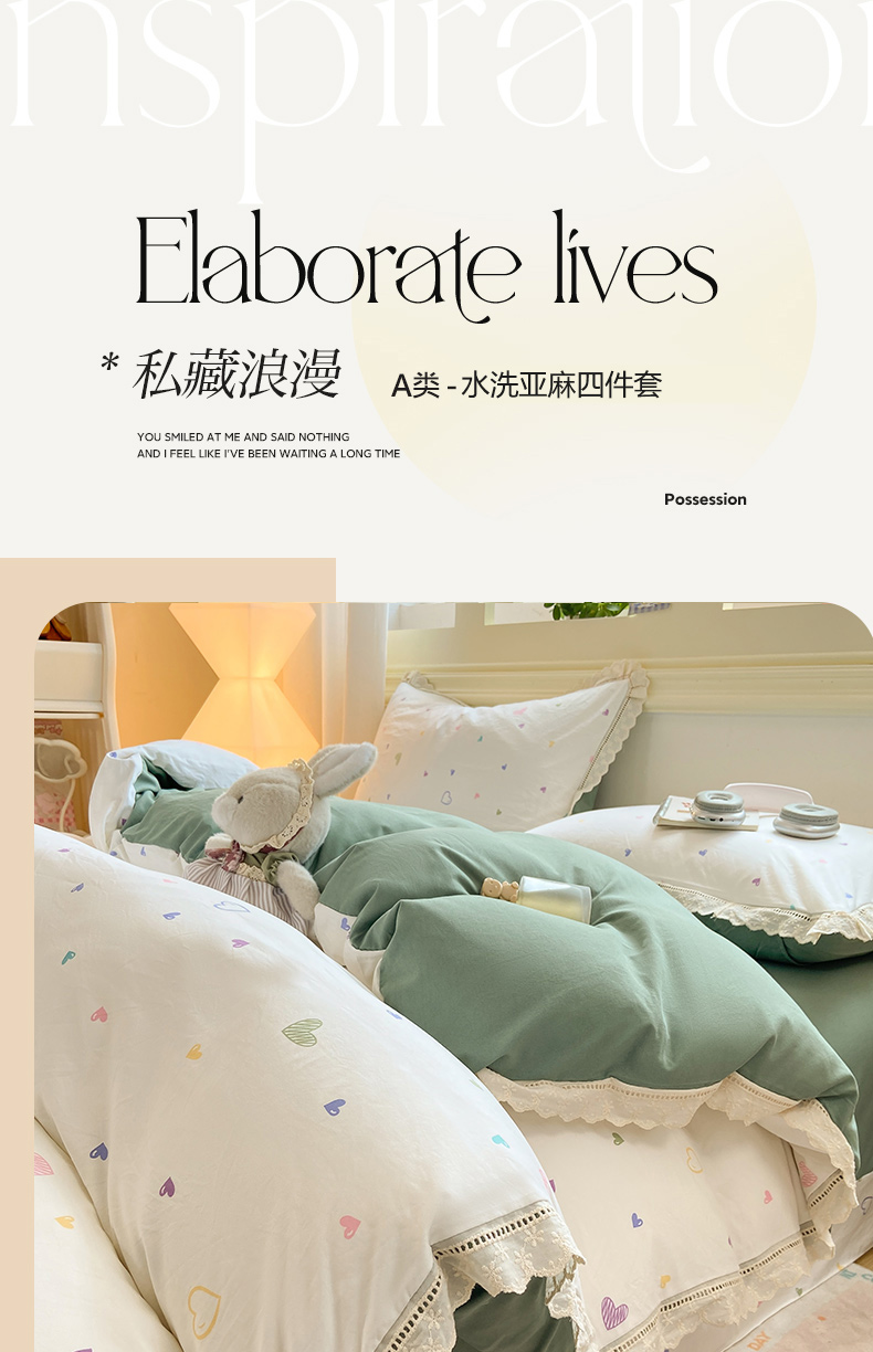 (总)大麦家纺 2025新款水洗亚麻花边四件套,粉黛佳人,风木槿咖,浮生花语,海棠花溪,花颜,锦瑟,满园花开,山花浪漫,颂青时,香榭花园,玉茗