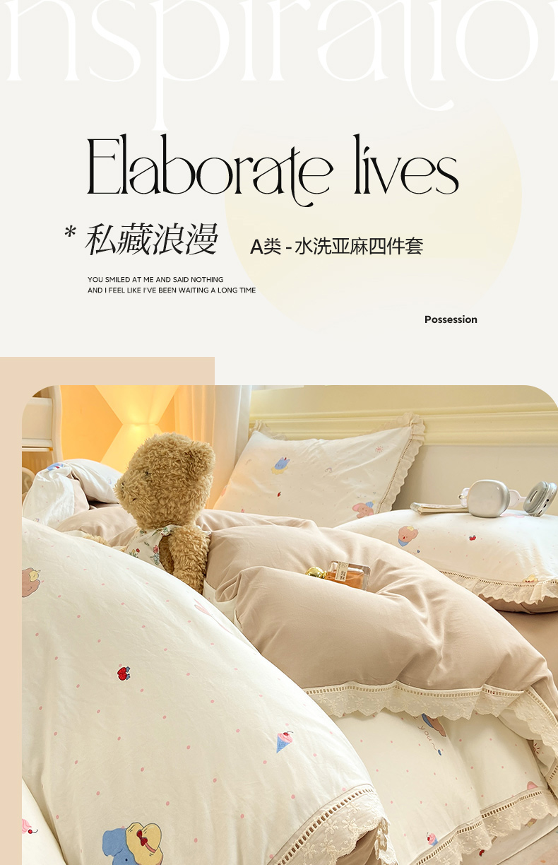 (总)大麦家纺 2025新款水洗亚麻花边四件套,粉黛佳人,风木槿咖,浮生花语,海棠花溪,花颜,锦瑟,满园花开,山花浪漫,颂青时,香榭花园,玉茗