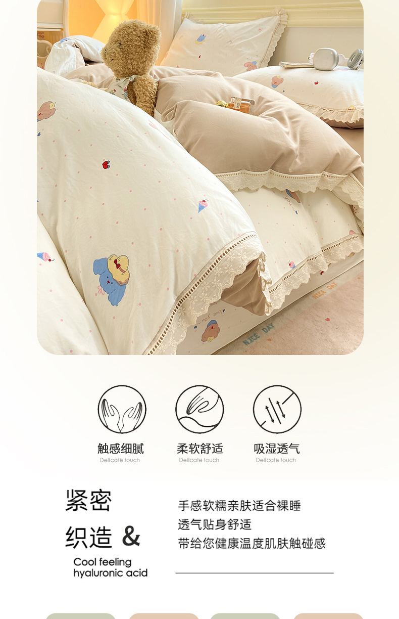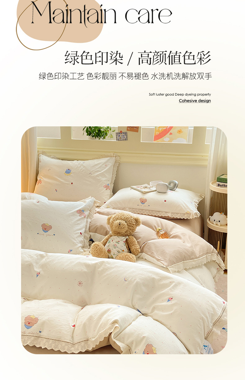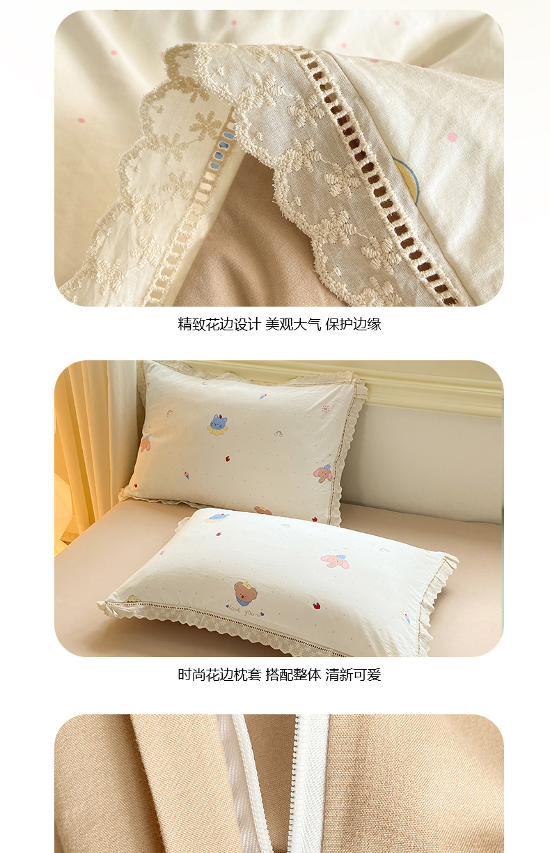 大麦家纺 25年新款高克重印花水洗棉花边四件套 晚安小眠
