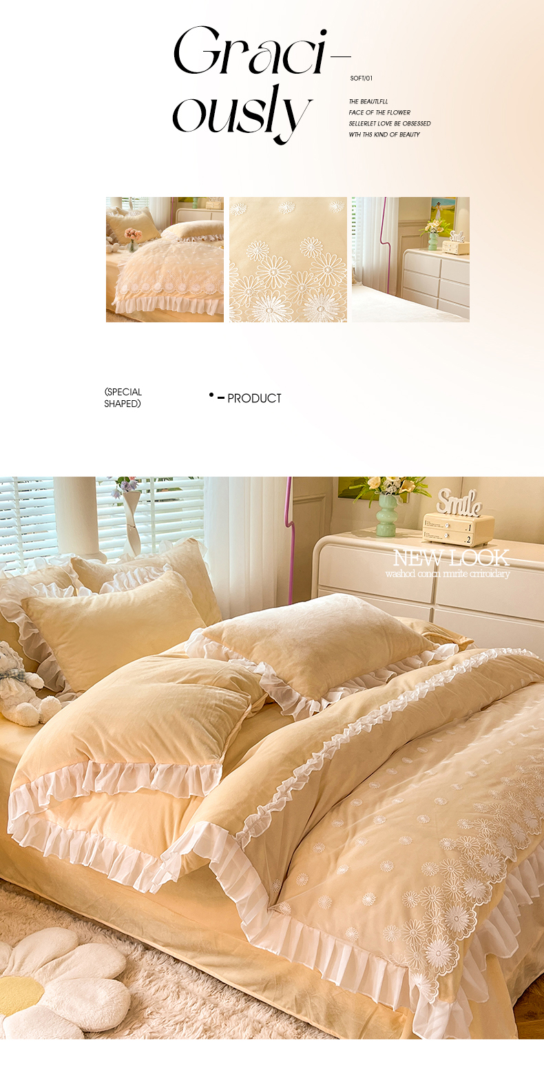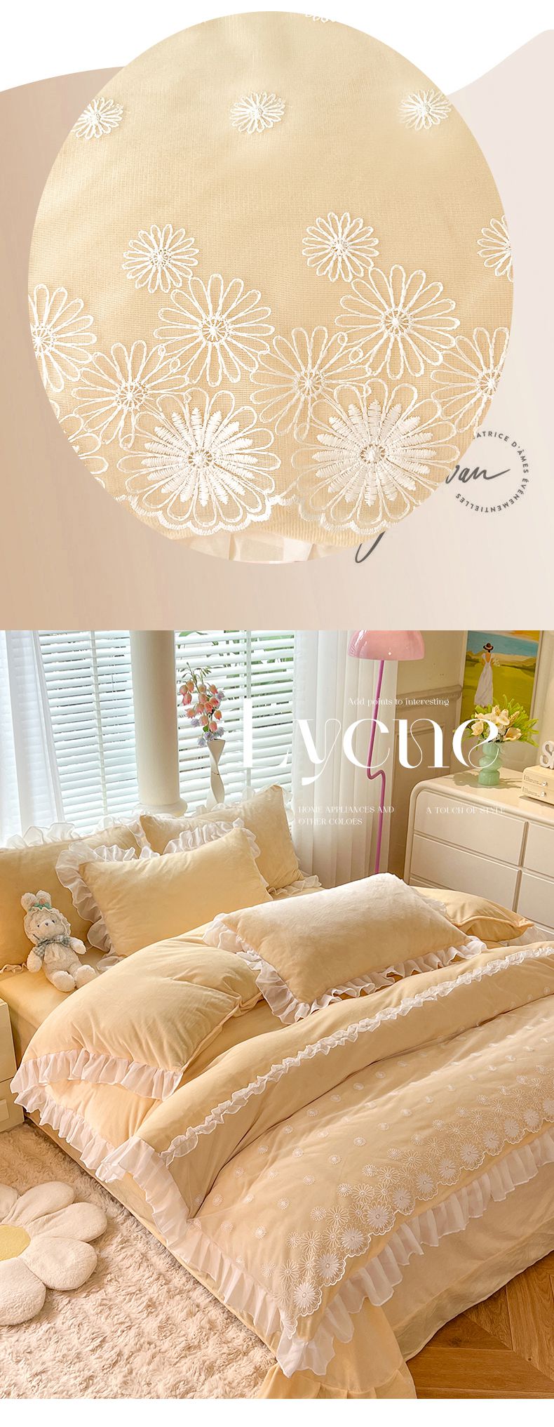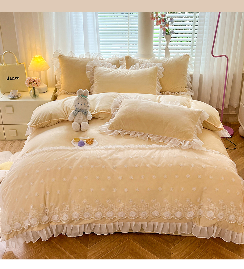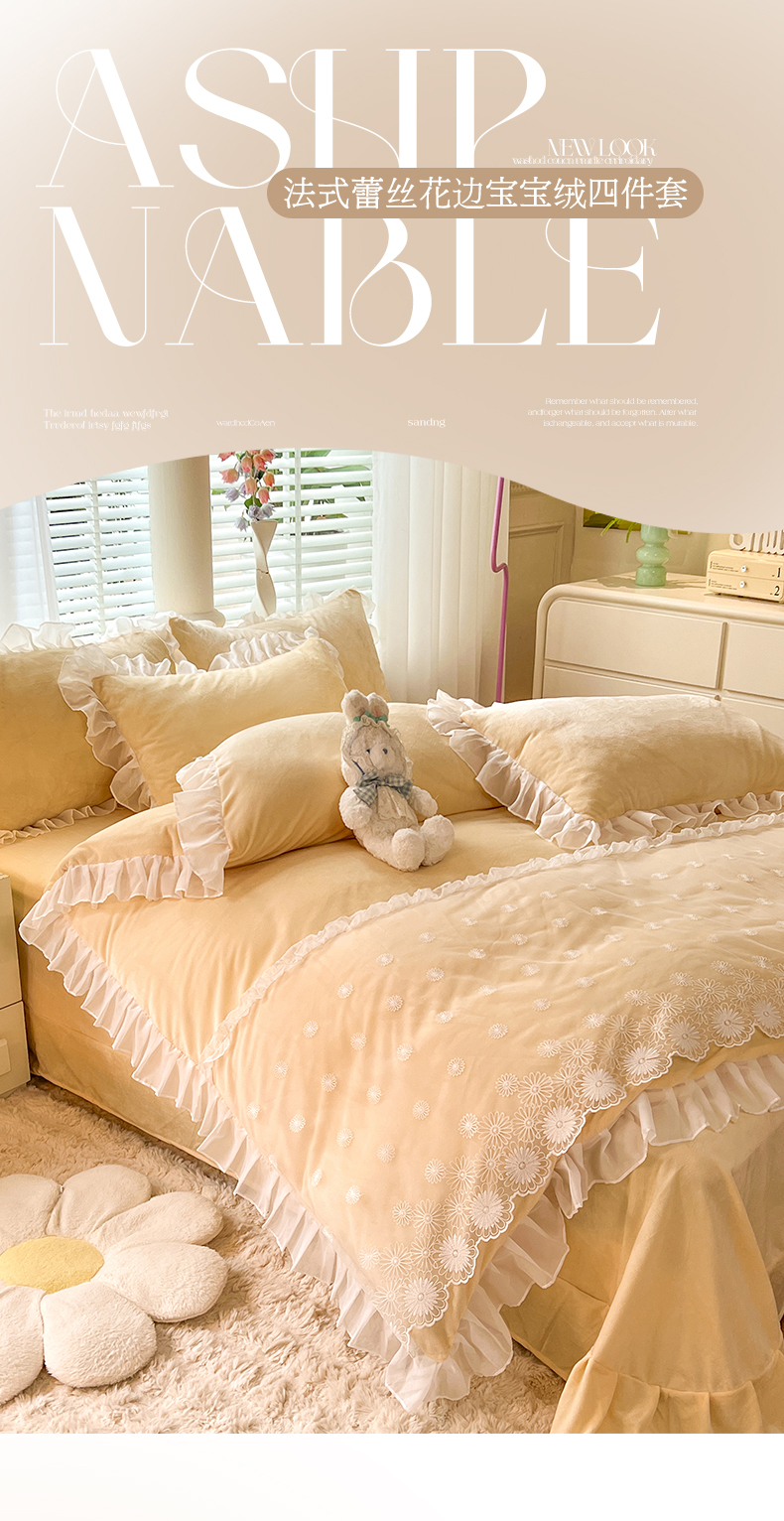 商品名称:唐人居 2025新款法式蕾丝花边宝宝绒四件套--安妮系列 安妮-黄