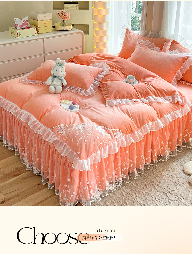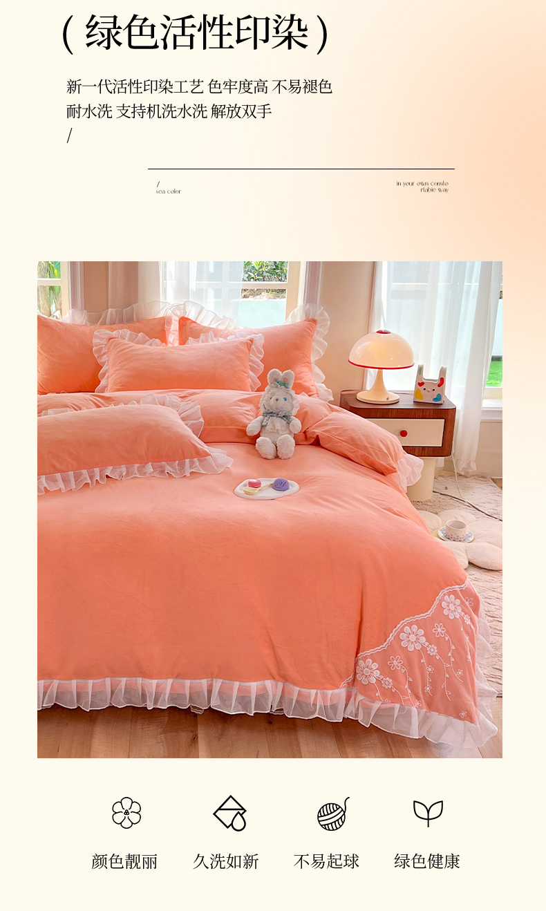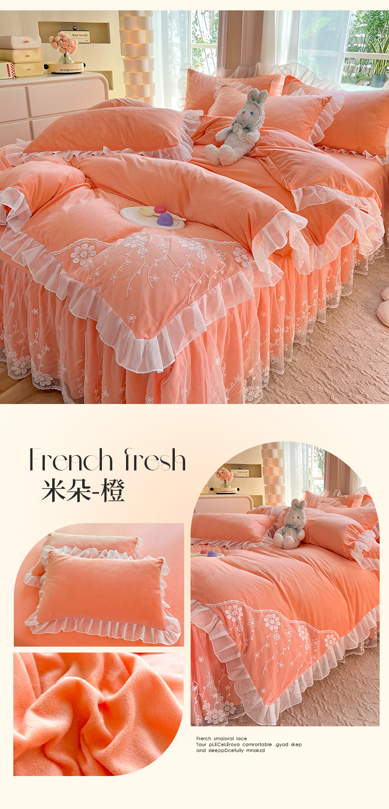 商品名称:唐人居 2025新款宝宝绒蕾丝花边四件套--米朵系列 米朵-橙