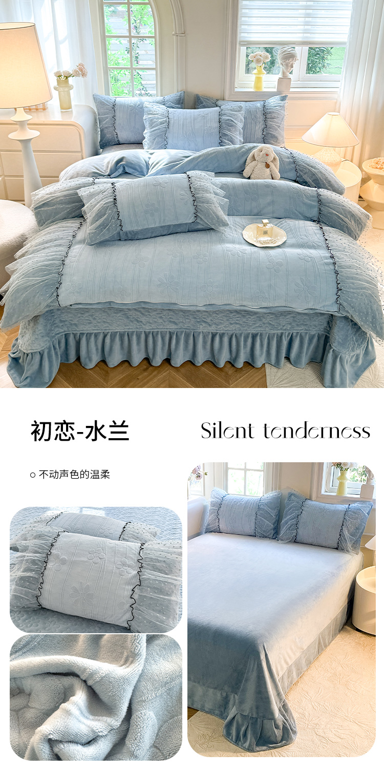 商品名称:唐人居 2025新款雕花牛奶绒花边四件套--初恋系列 初恋-水兰