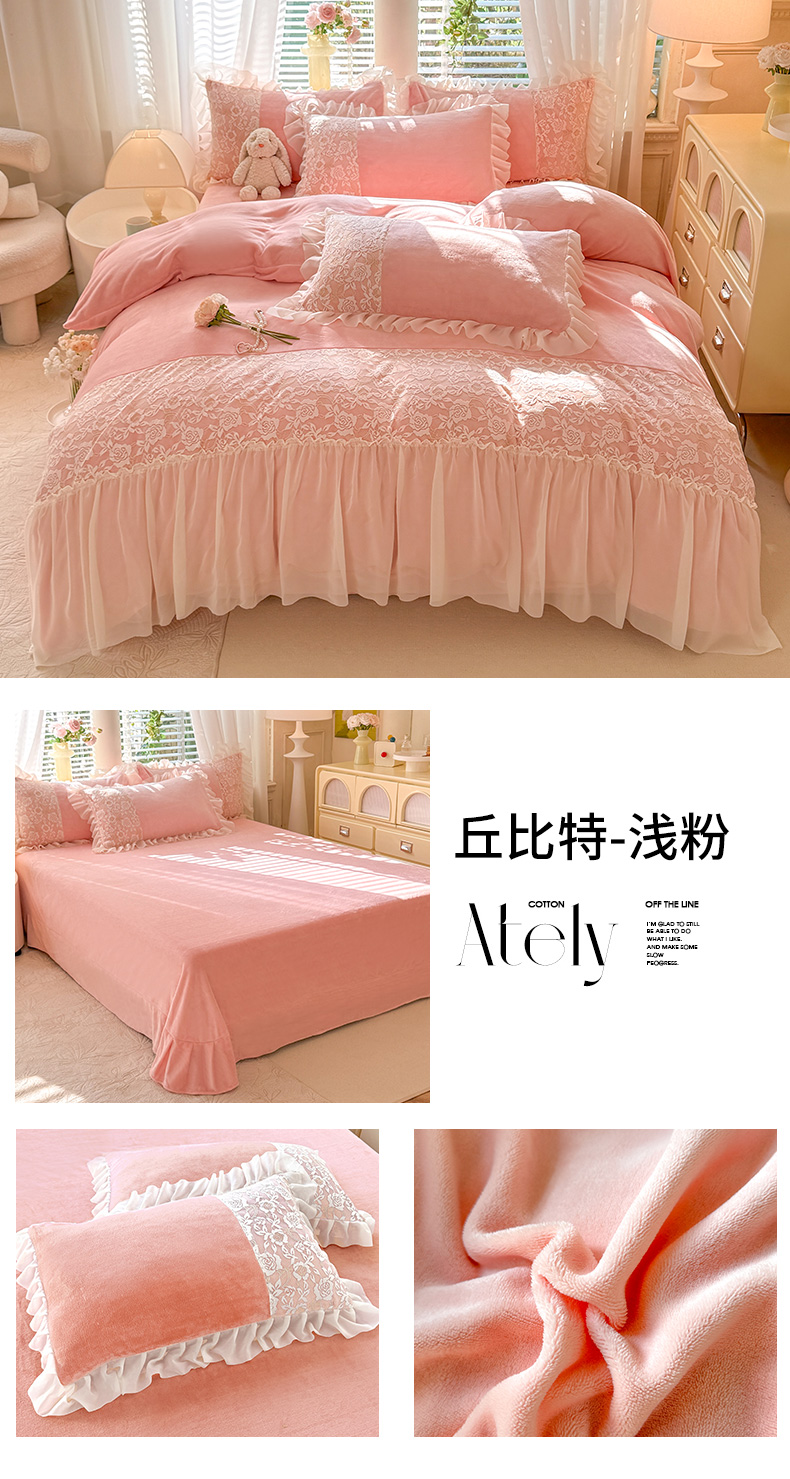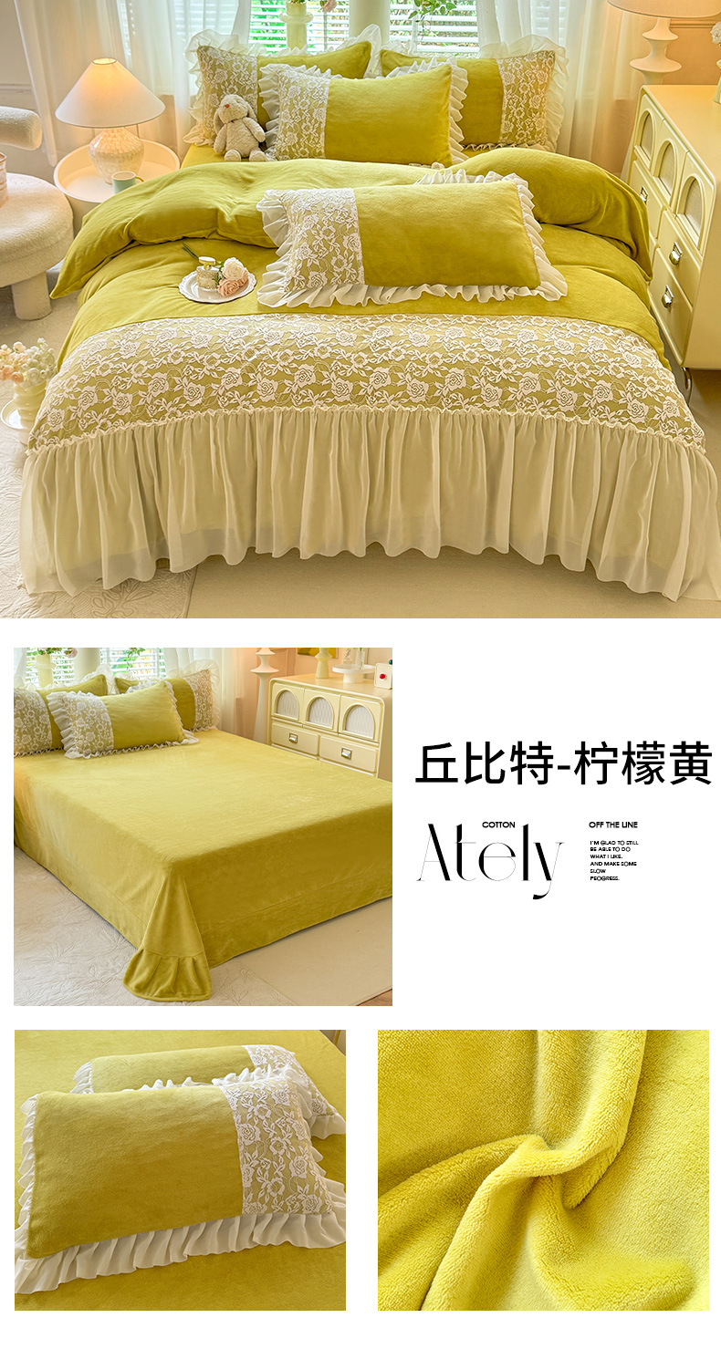 商品名称:唐人居 2025新款高克重牛奶绒蕾丝雪纺花边四件套-丘比特 丘比特-浅绿