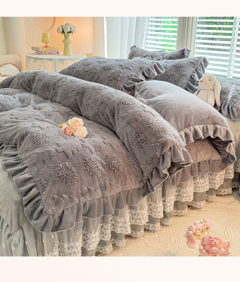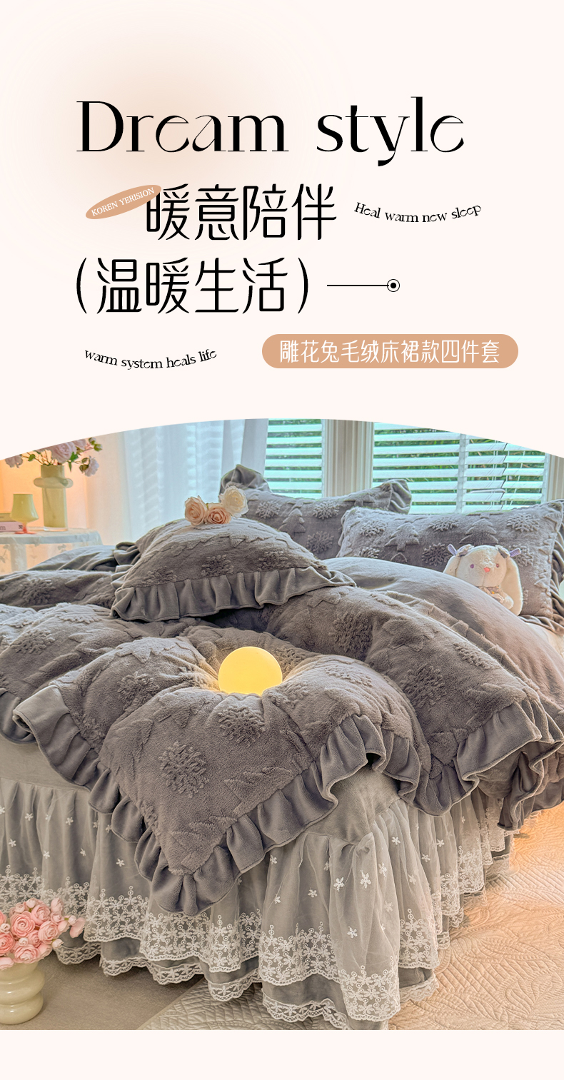 商品名称:唐人居 2025新款雕花花边兔毛绒床裙四件套 小树林-奶黄