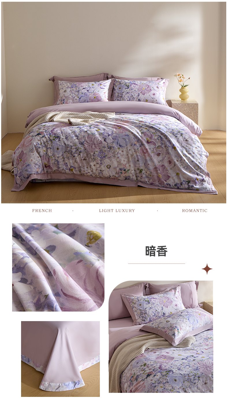 商品名称:禾时 2025新款全棉纯棉贡缎数码50双股长绒棉磨毛四件套(带高档礼盒) 蔷薇花园(浅紫)