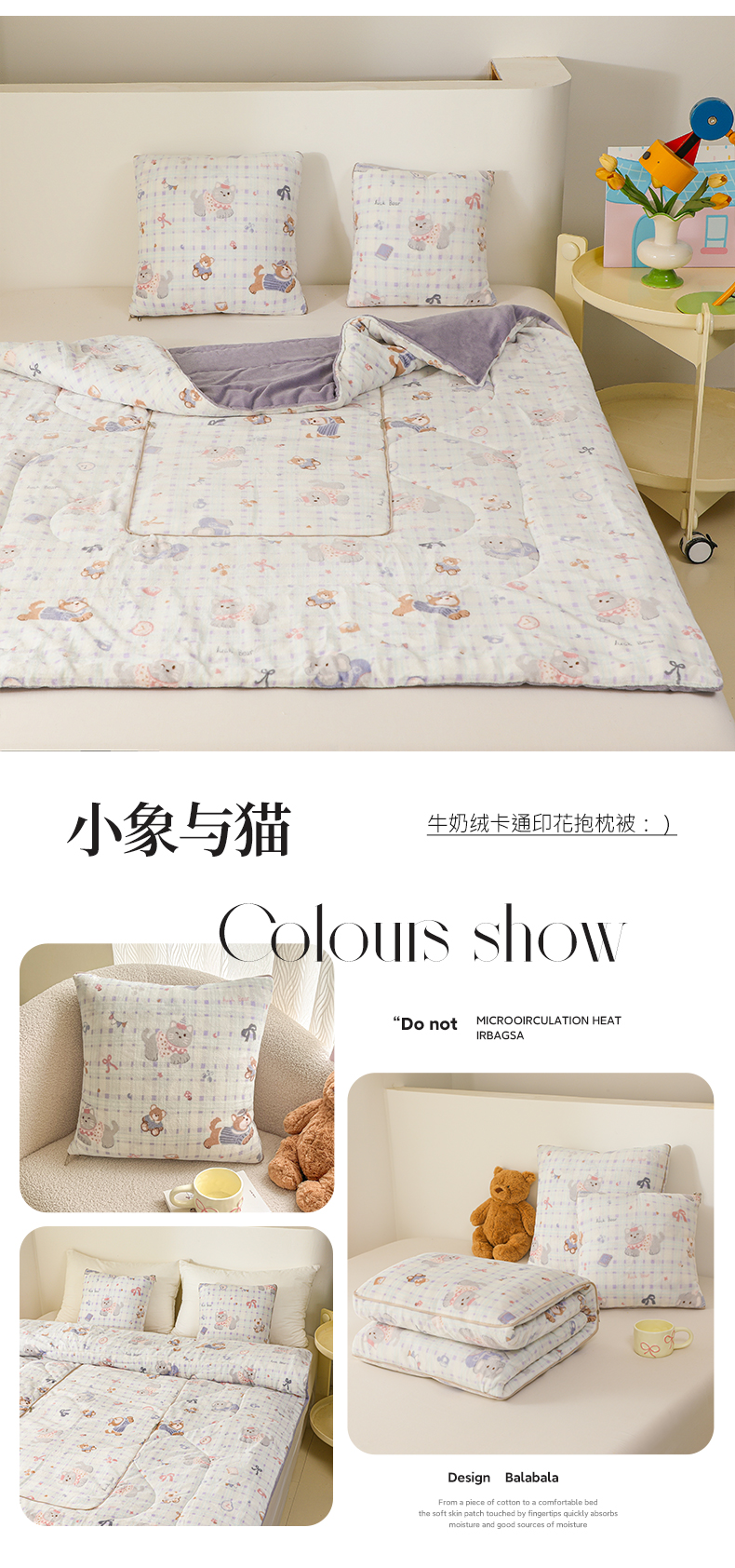 商品名称:番茄+ 2025新款牛奶绒卡通印花抱枕被 小象与猫咪