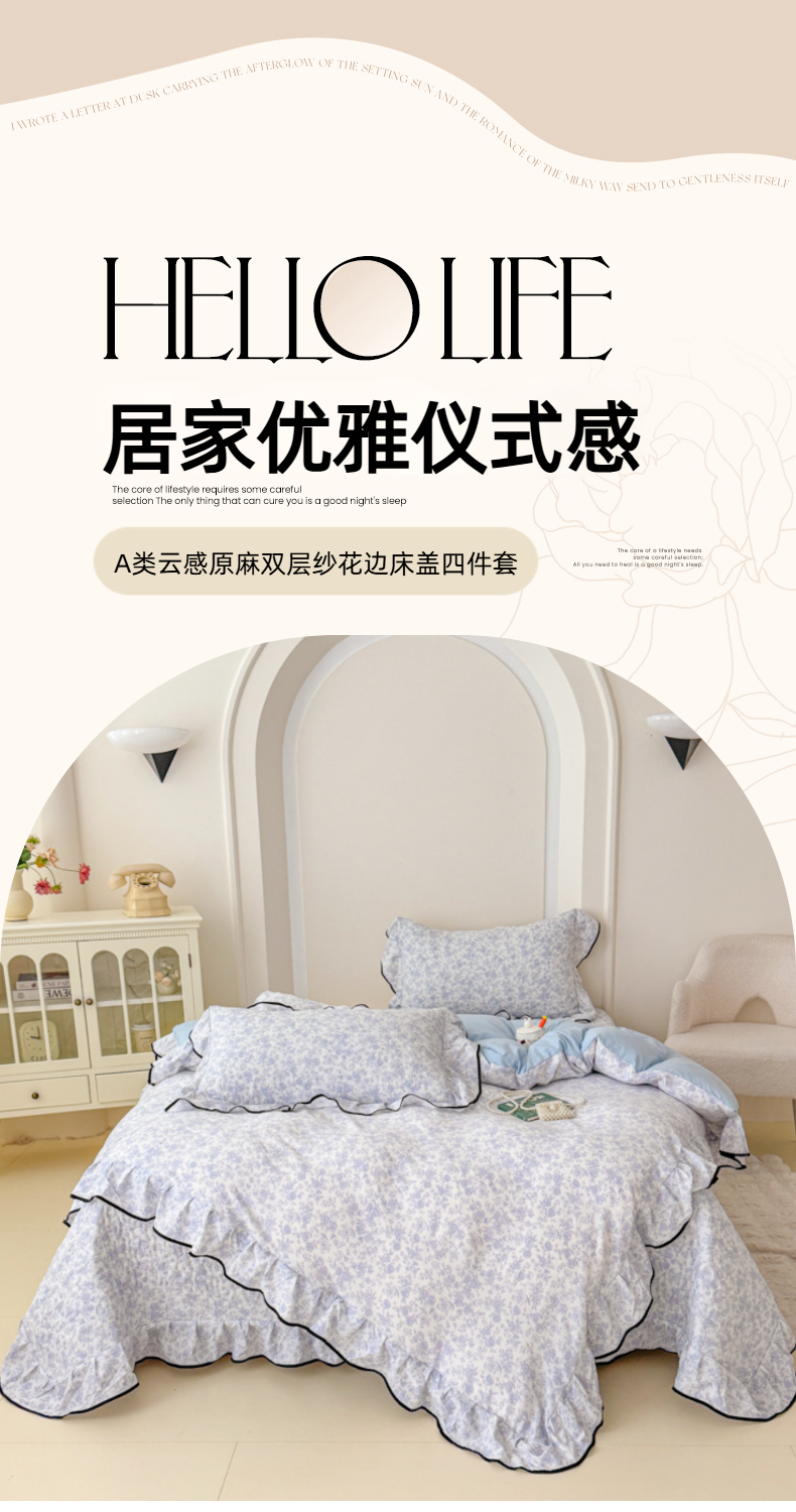商品名称:小萌虎 2025新款A类云感原麻双层纱花边床盖四件套 静初【花边款】