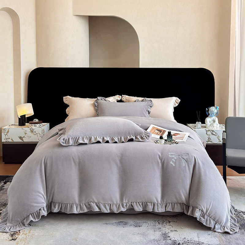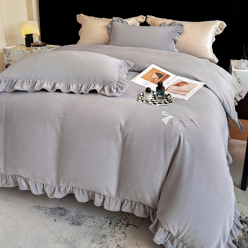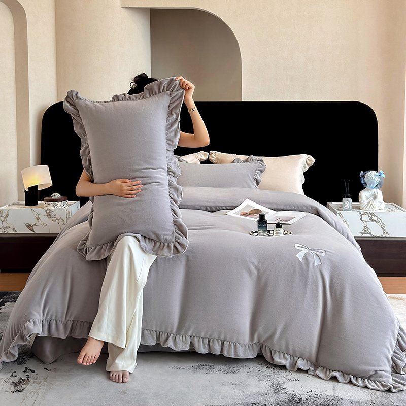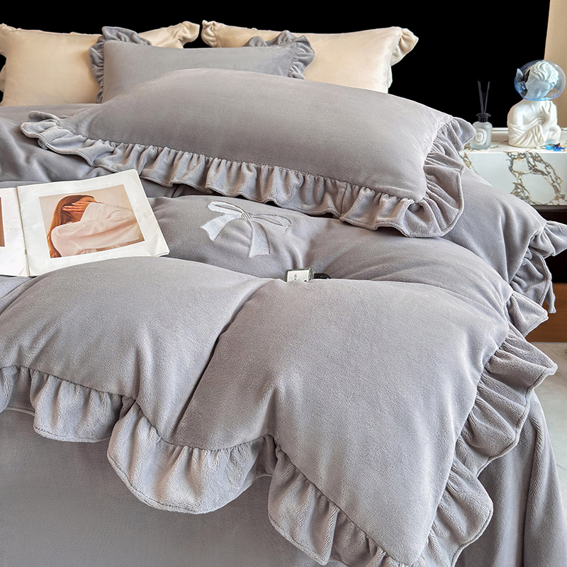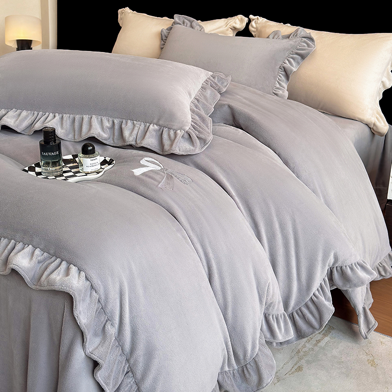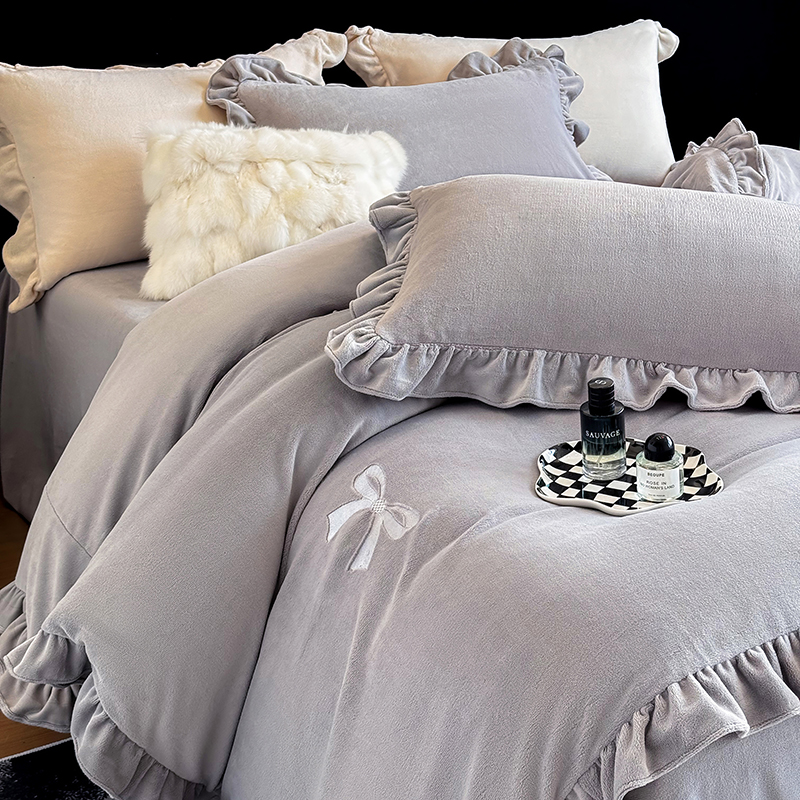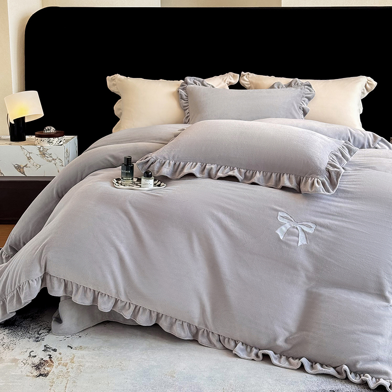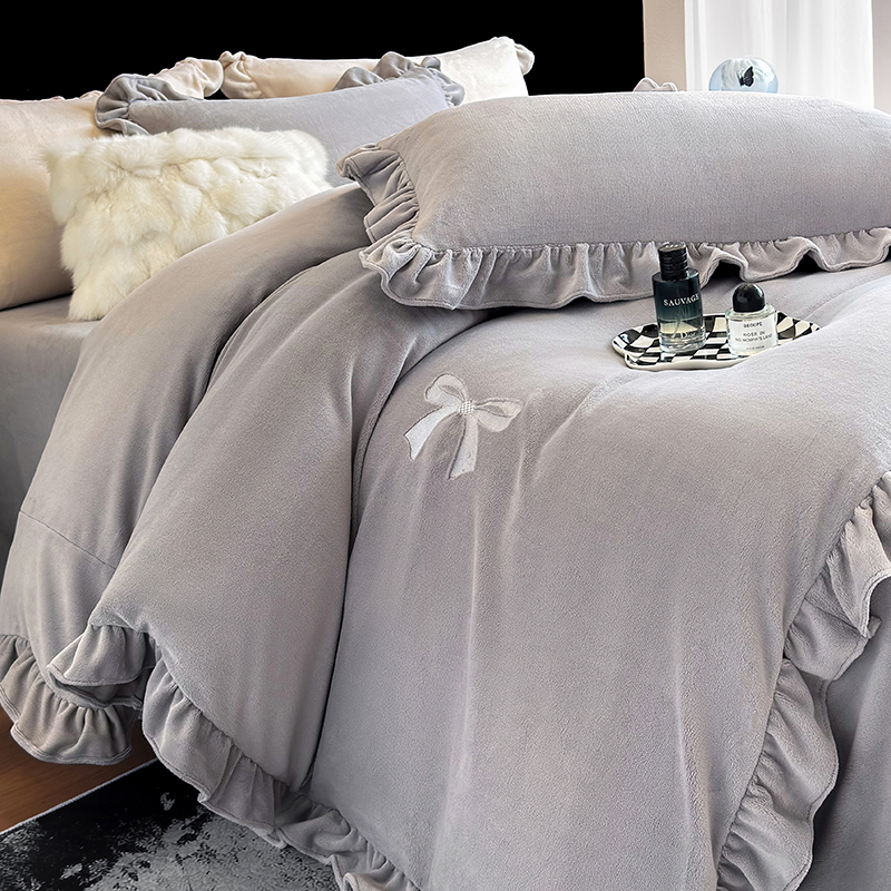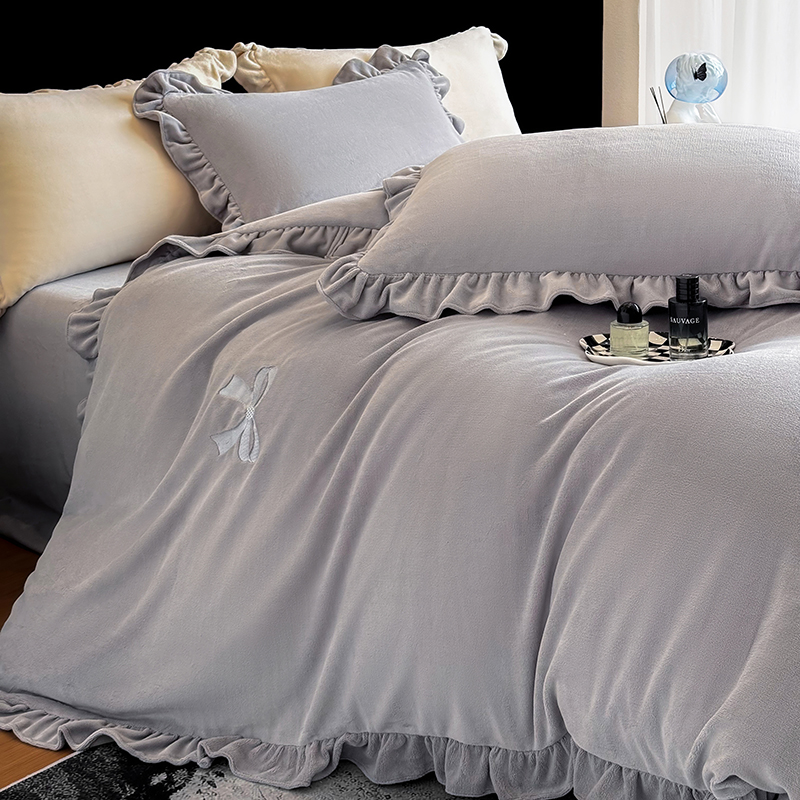 2025新款蝴蝶结绣花牛奶绒四件套 蝴蝶结-雅士灰