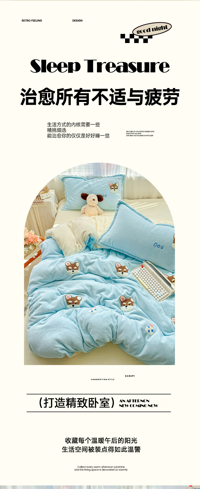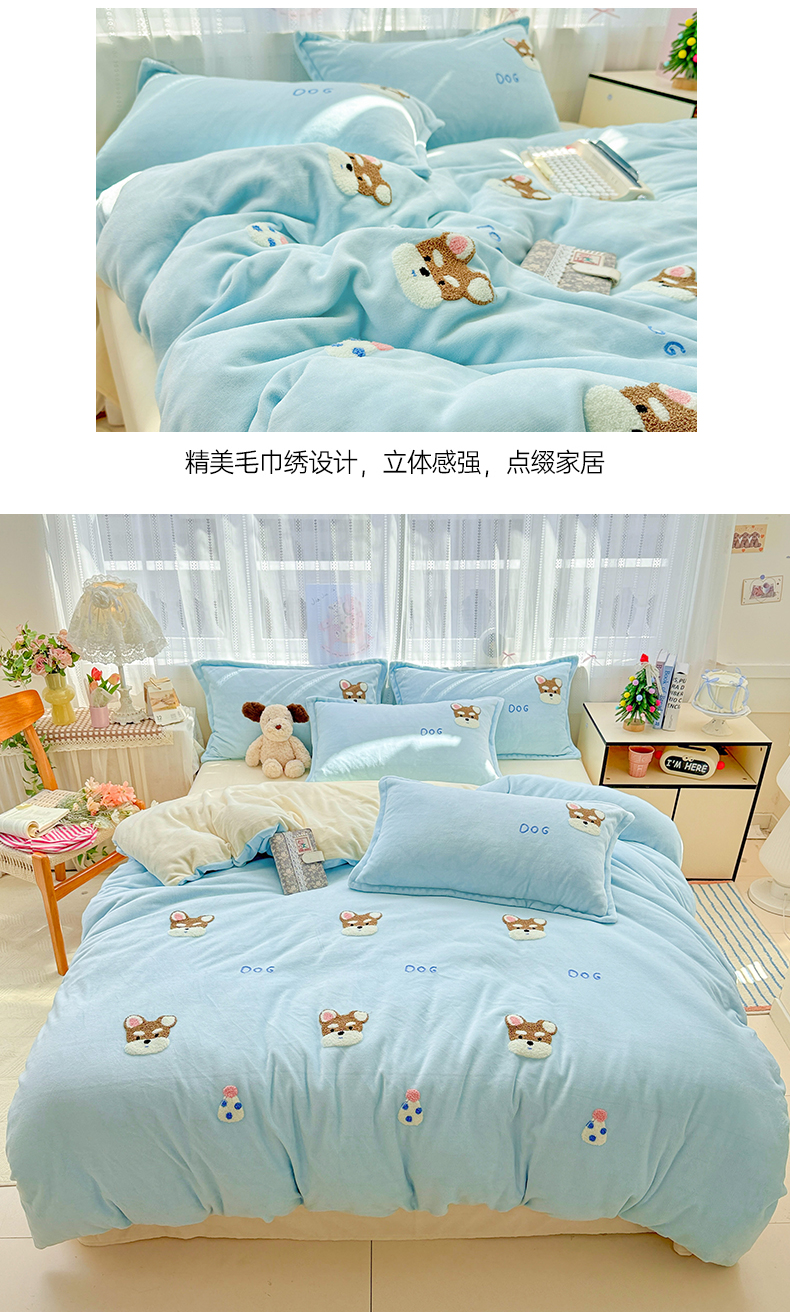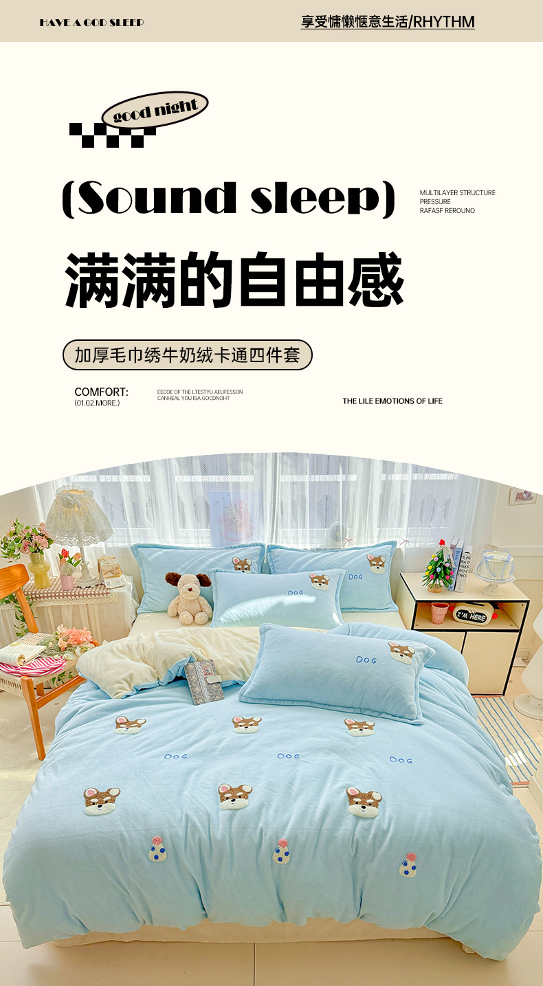 (总)KT猫直营店 2025新款高克重大毛巾绣牛奶绒卡通四件套,爱心布布,大耳朵兔子,精灵皮卡,快乐小狗,冒险小新,小新快跑,笑笑狐,字母涂鸭
