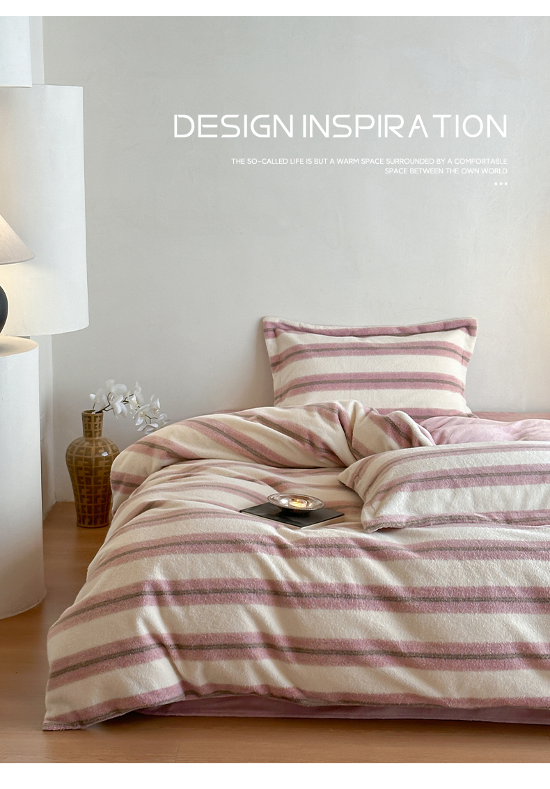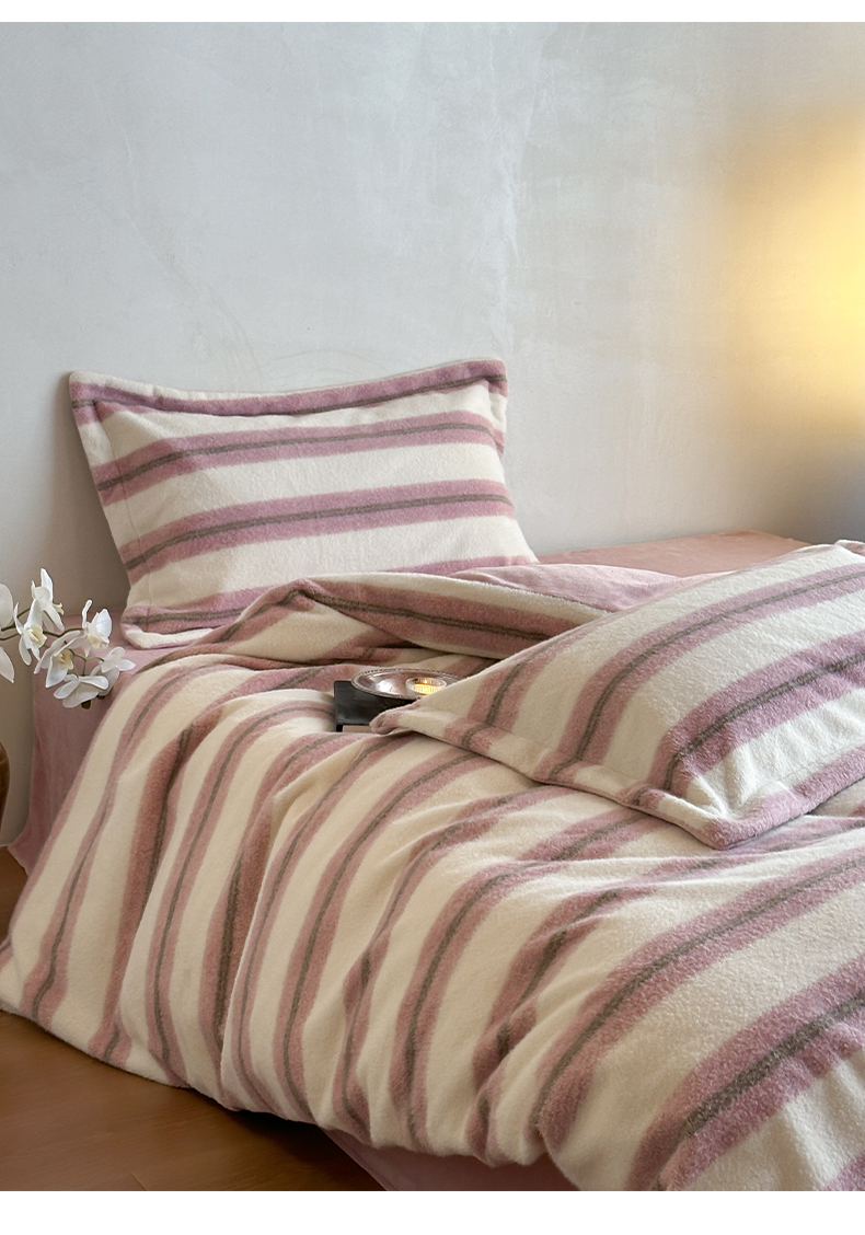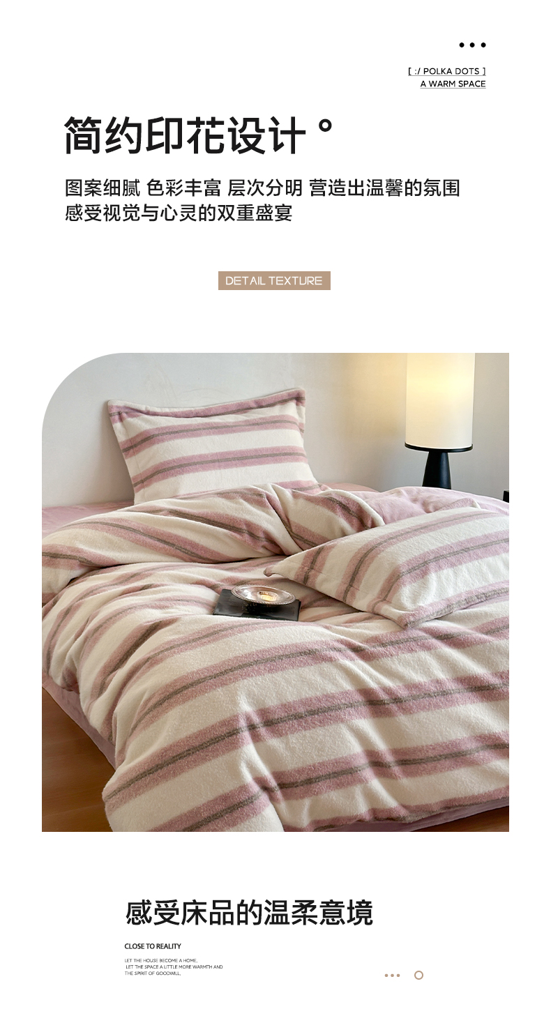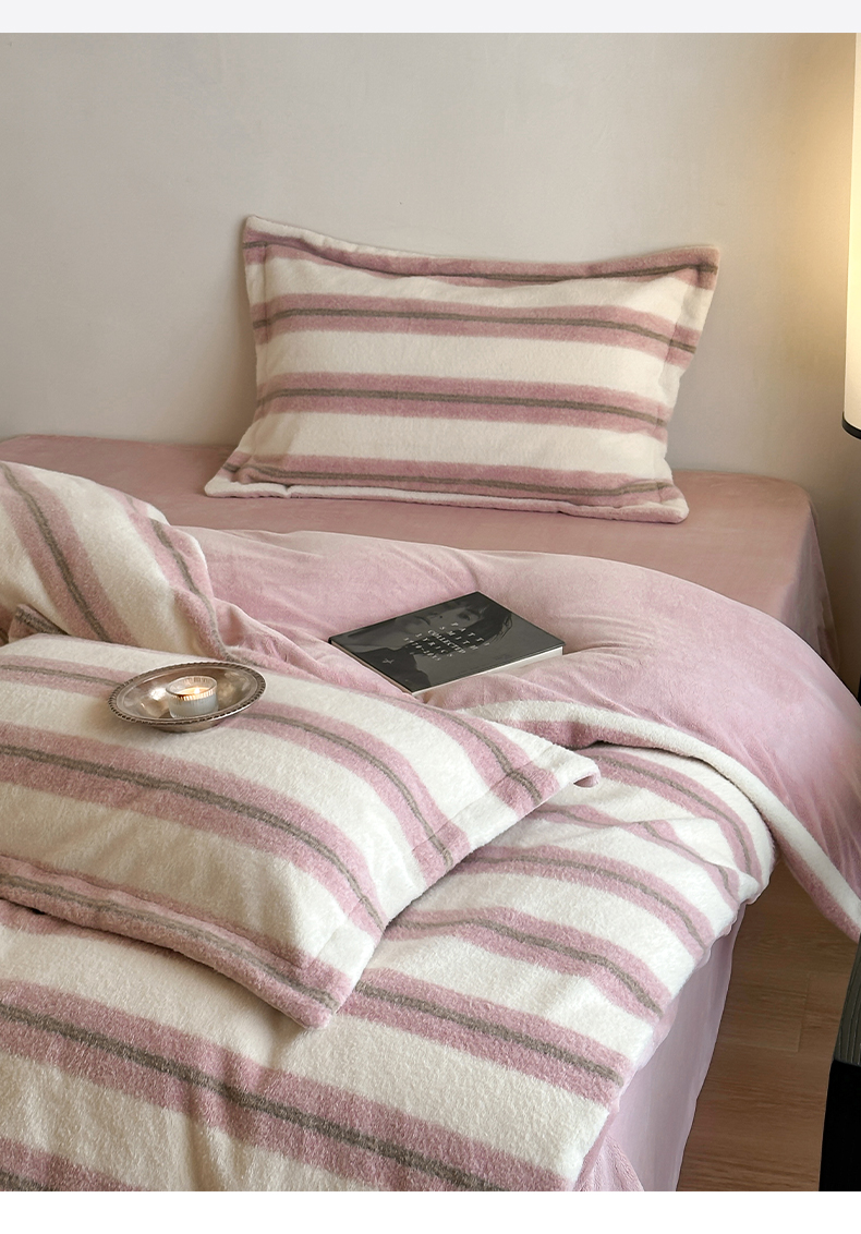 商品名称:凯罗 2025新款仿羊绒四件套高克重牛奶绒四件套仿羊绒格子条纹四件套 意韵-粉