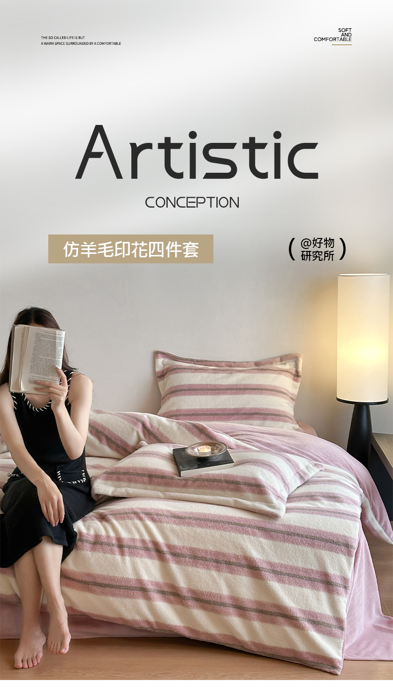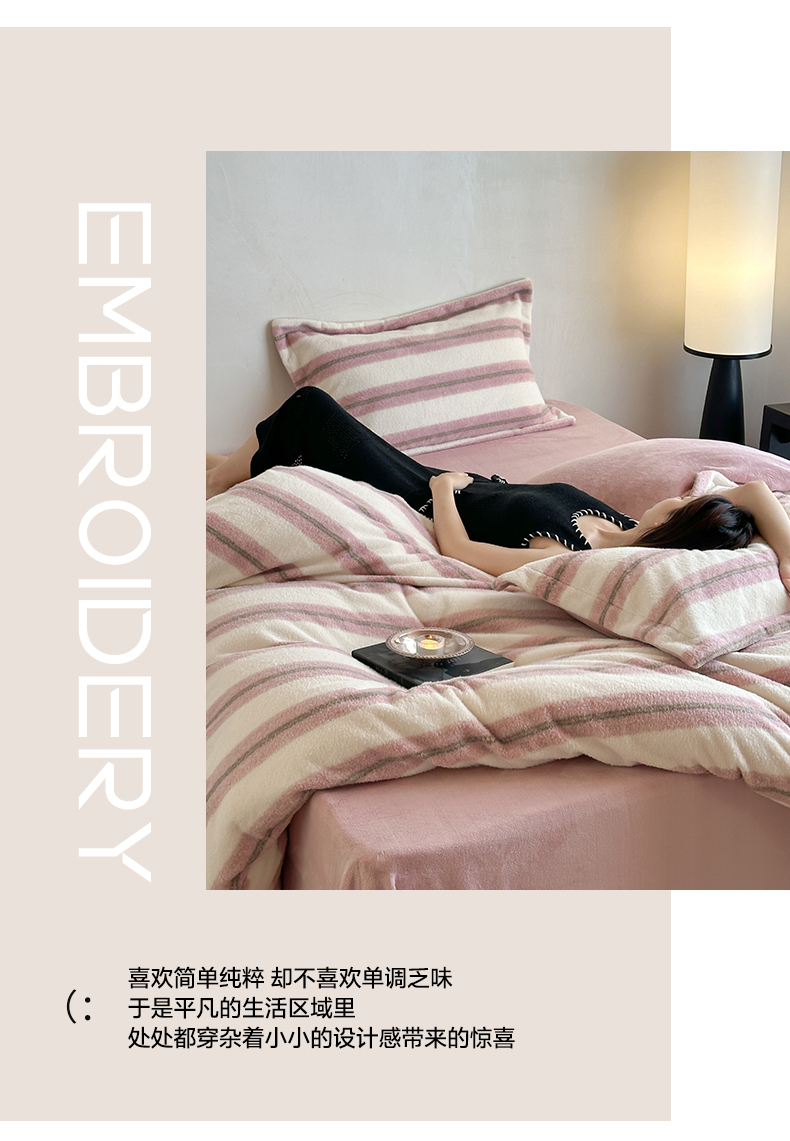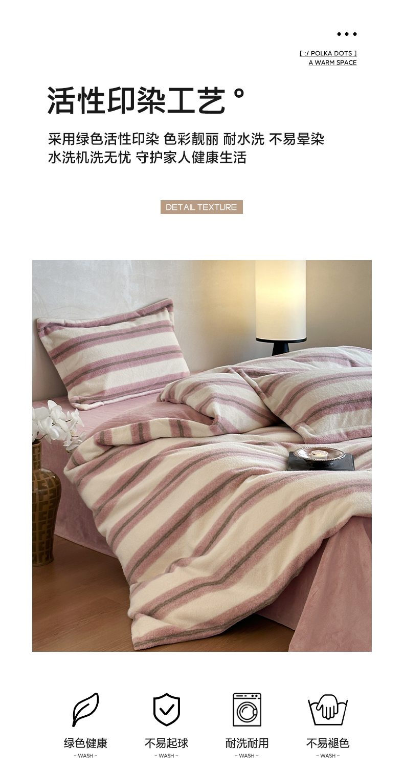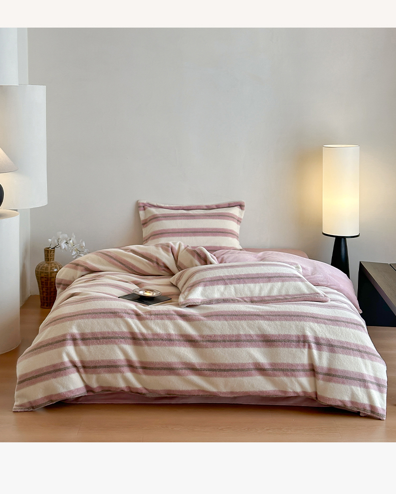 商品名称:凯罗 2025新款仿羊绒四件套高克重牛奶绒四件套仿羊绒格子条纹四件套 意韵-粉