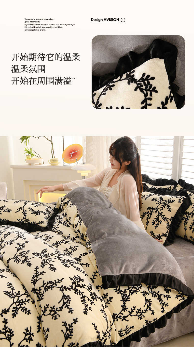紫月轩家纺 2025新款韩版牛奶绒花边款四件套 素枝