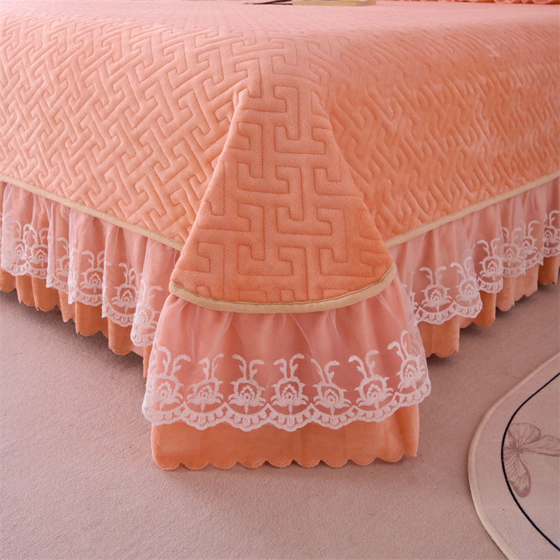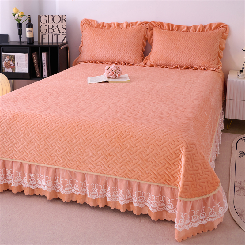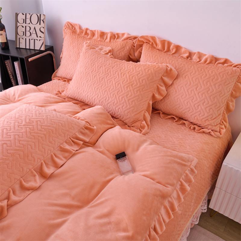 畅畅家纺 2025新款11斤纯色韩版冬季超柔加厚牛奶花边床盖四件套 橙色