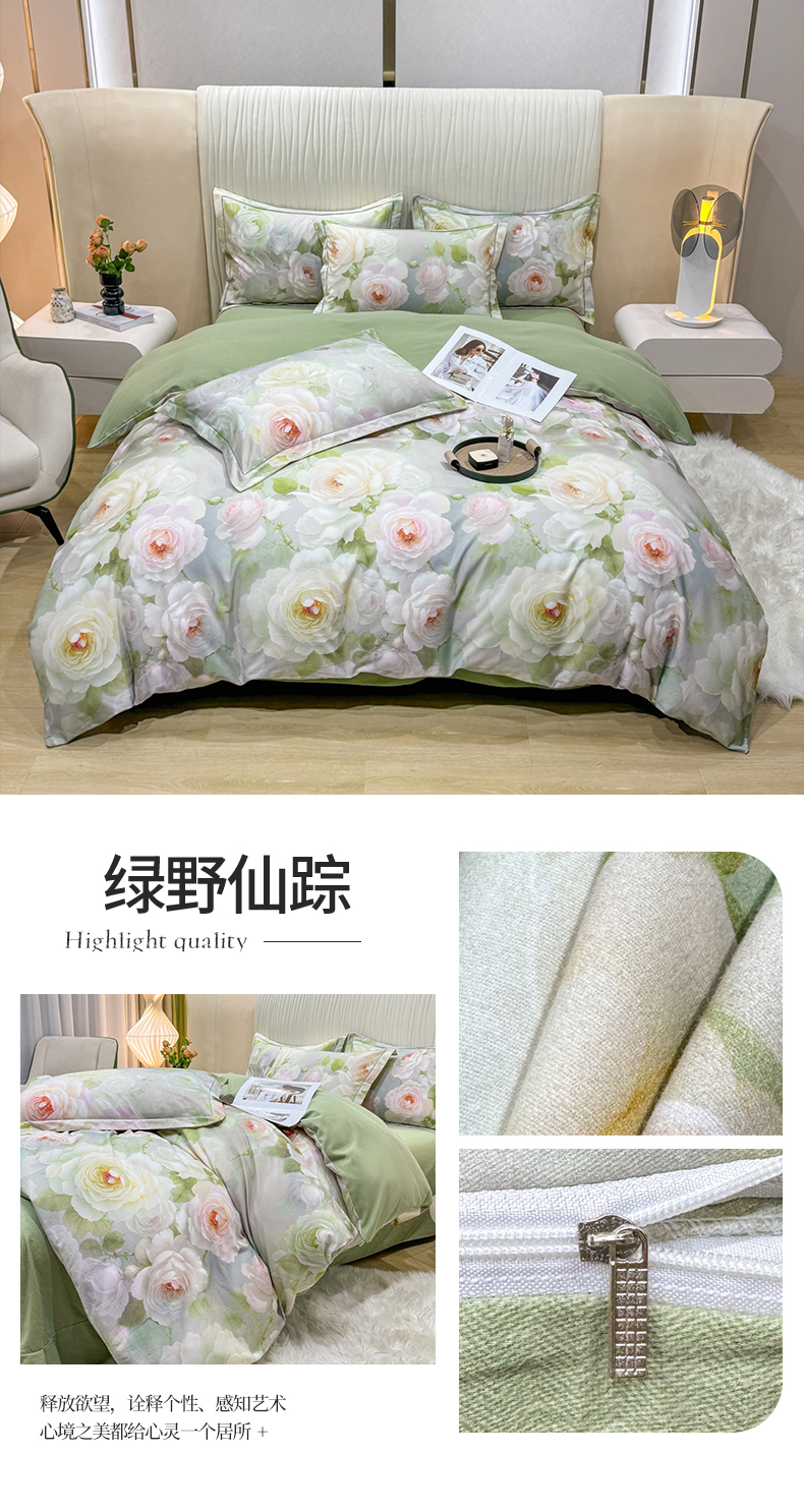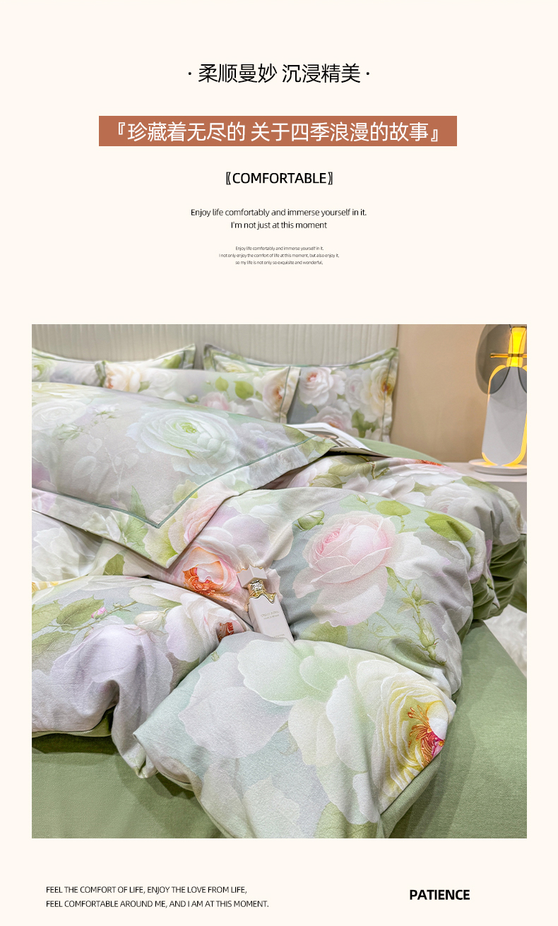 (总)红日子纺织品 2025新款全棉纯棉数码印花四件套,花暖容颜-绿,波斯记忆-蓝,茶山露水-桔,淡雅清风-蓝,芳若-绿,花情共舞-米,焕彩玫瑰-黄,美尼尔-粉,莫兰迪-紫,莫妮花园-粉,浓情蜜意-粉,翩翩花语-绿,秋日盛情-黄,日落花雨-灰,如若梦境-绿,诗丹娜-深蓝,邂逅柔情-蓝,秀雅佳人-灰
