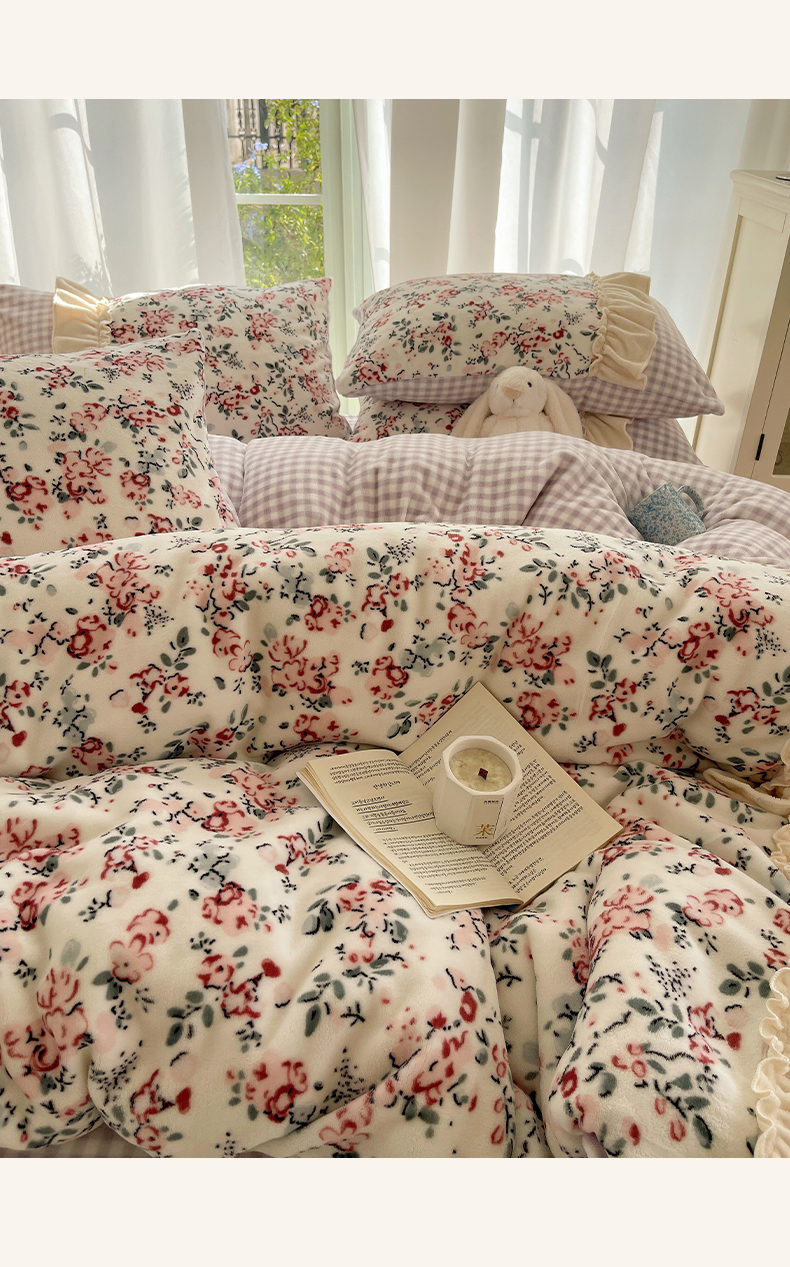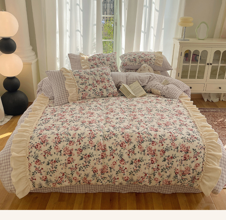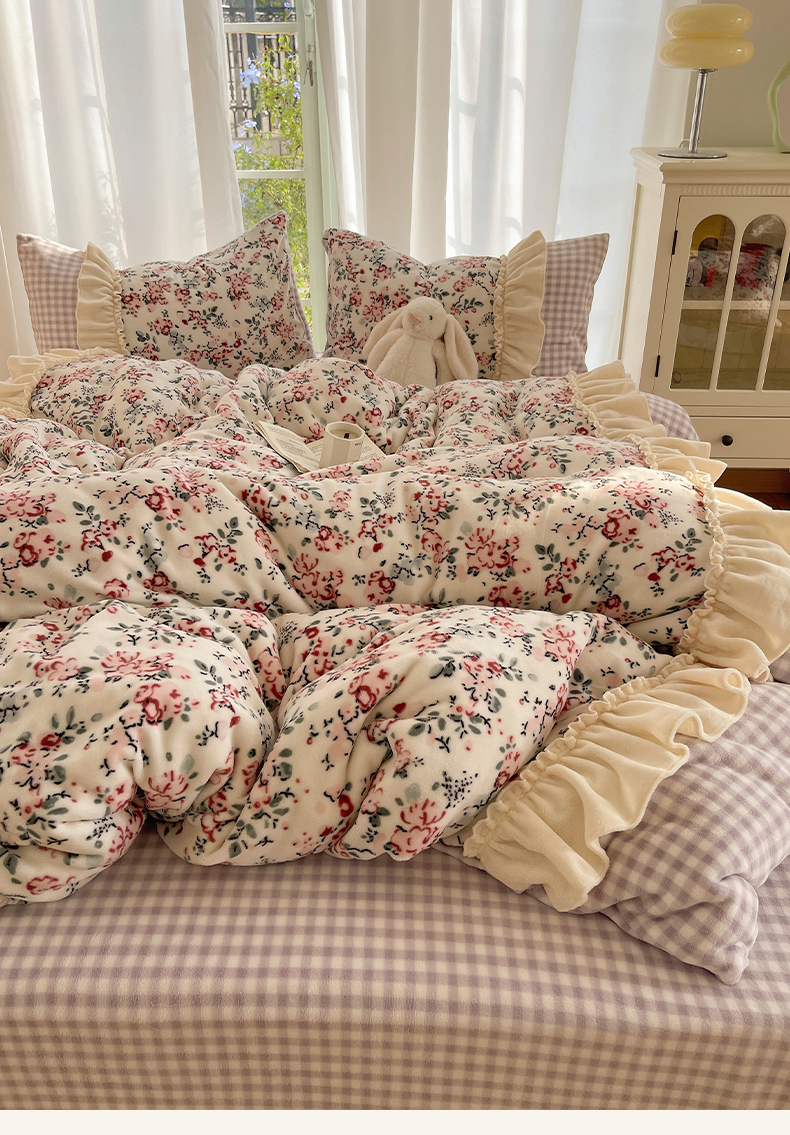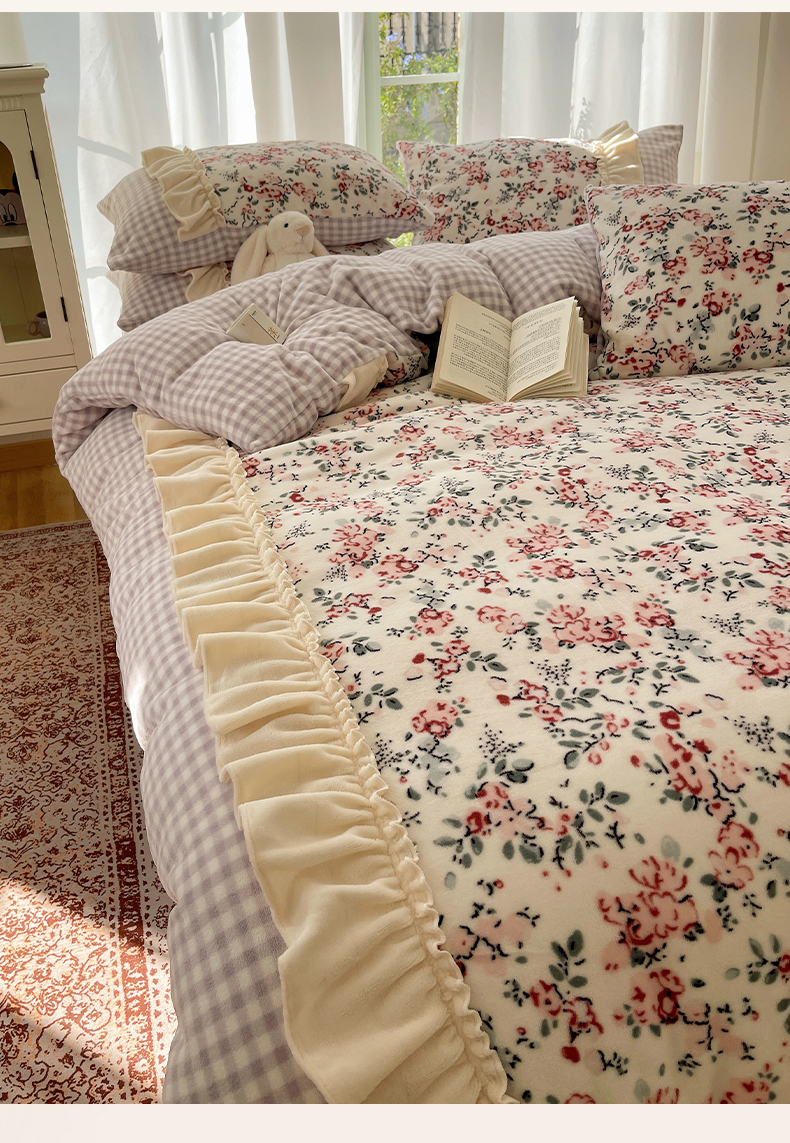 瑞莱 (持续上新)2025冬季新款拼接款花边牛奶绒四件套 雪中梅