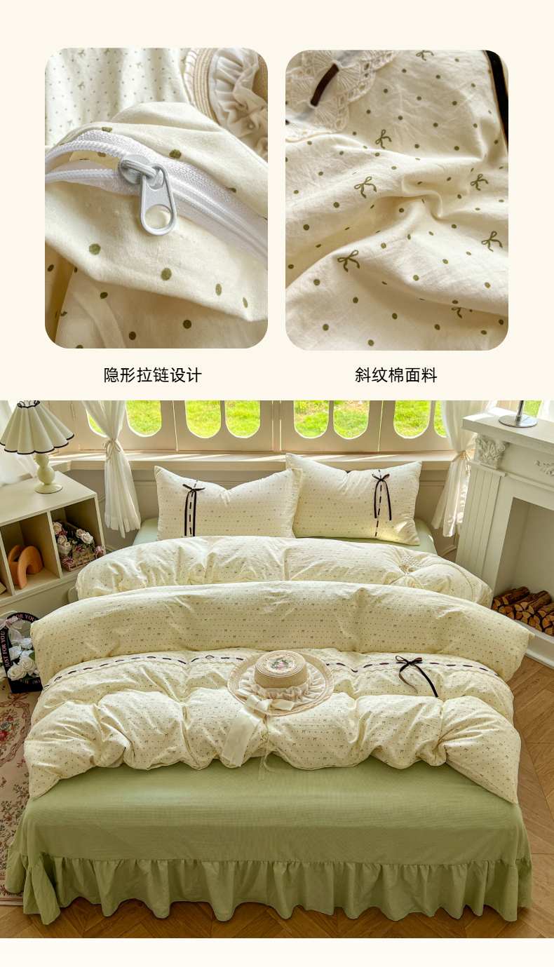 商品名称:老K (原美阁) 2025新款床裙款蝴蝶结细丝斜纹韩版四件套 绿色小碎花
