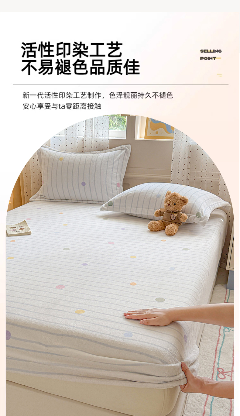 • 91家纺网 家纺一手货源 找家纺 丽美人 2025新款高克重印花牛奶绒无印风床笠款(A类母婴级面料) 波点蓝条